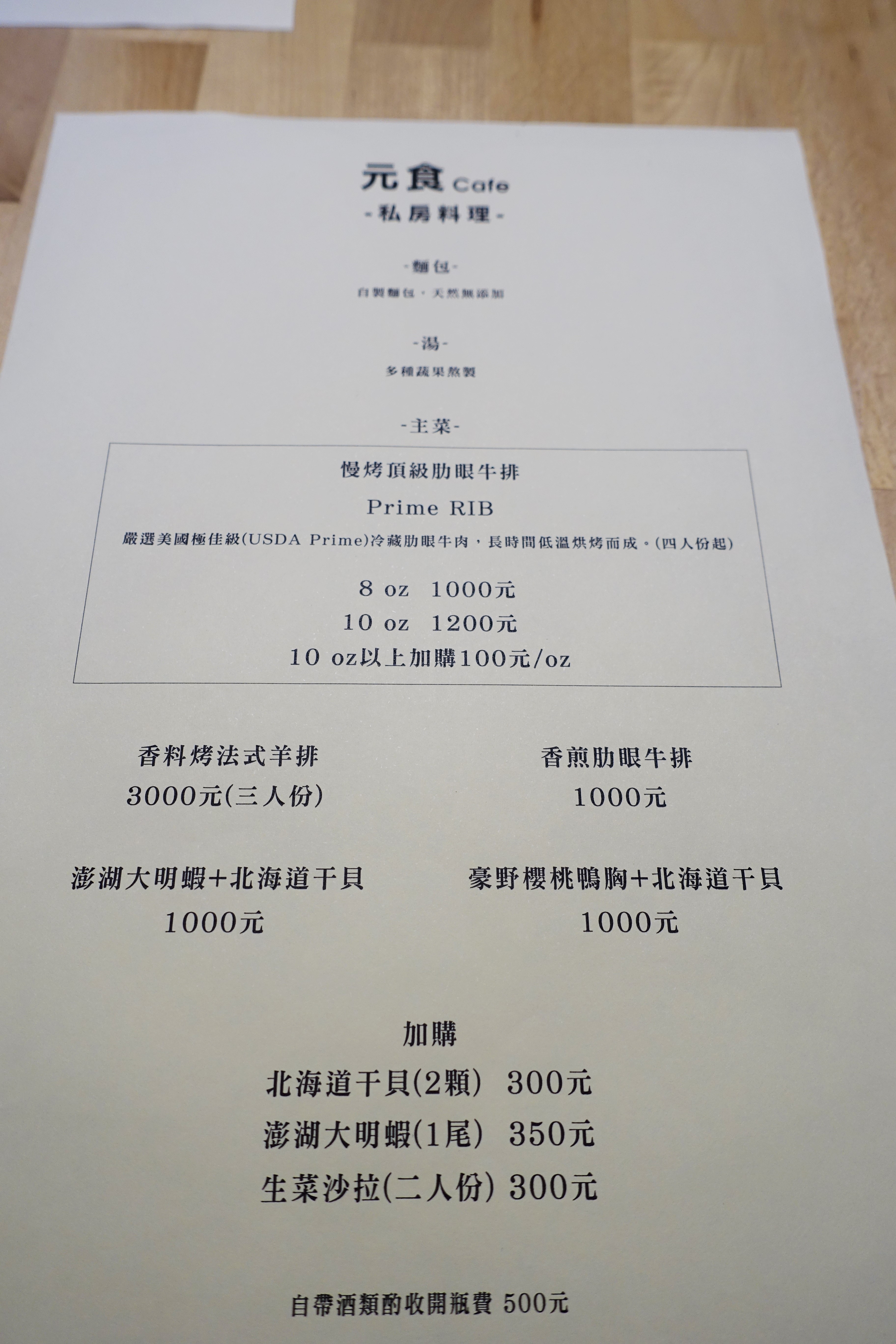元食以頂級肋眼牛排為主,其他加購部分也需提前預約,每次預約至少要四人以上,店家說因為要四人以上才有辦法平攤成本。
