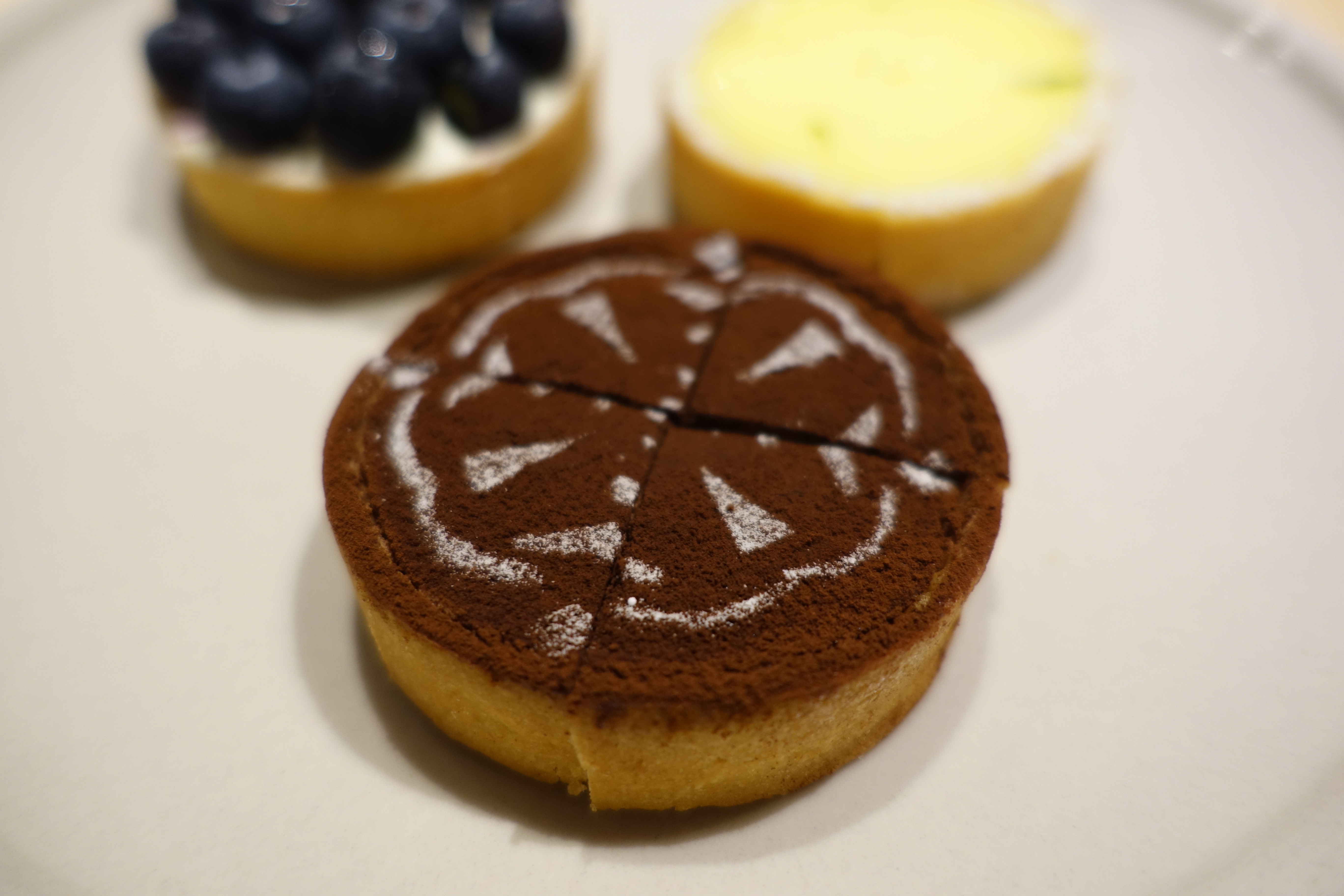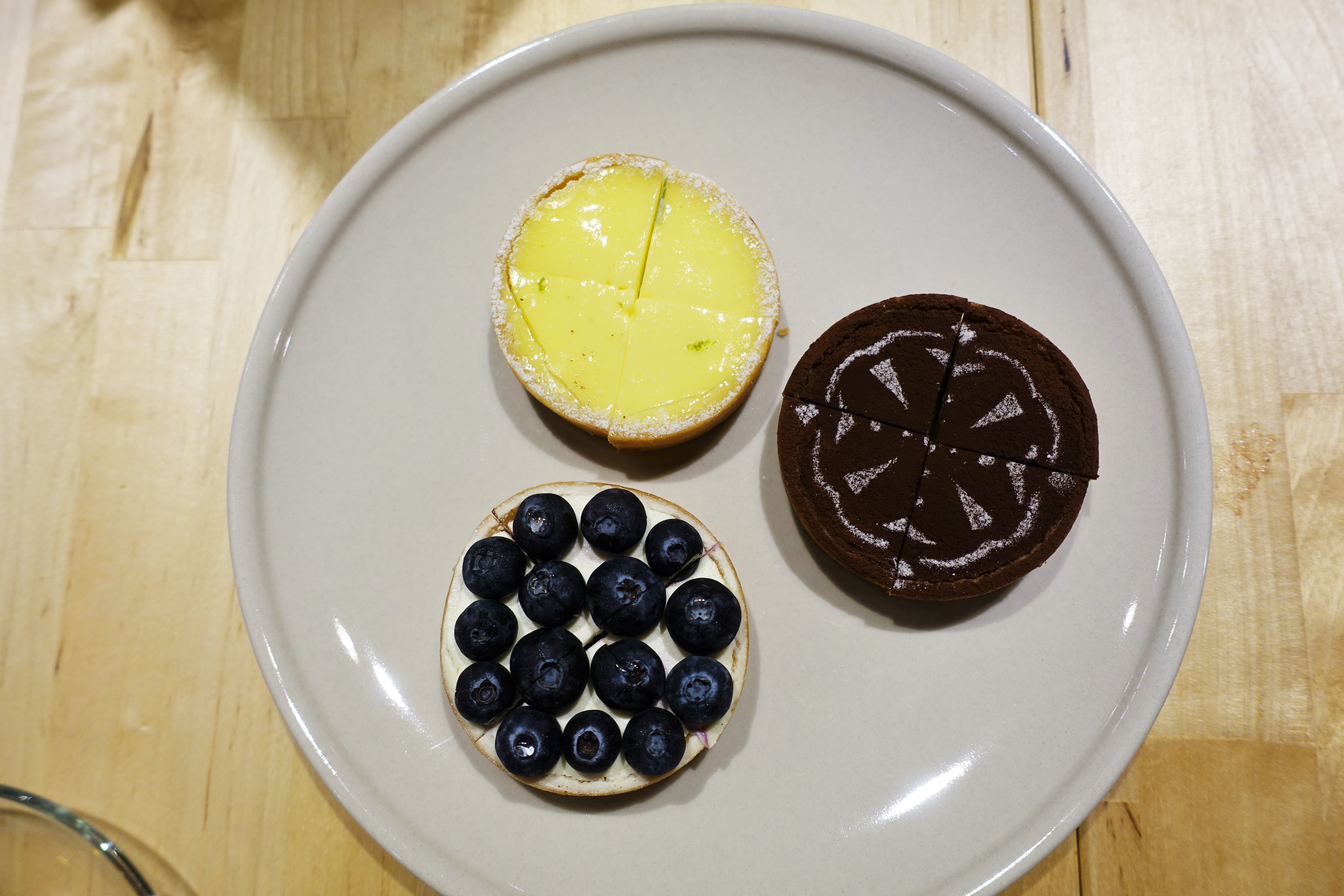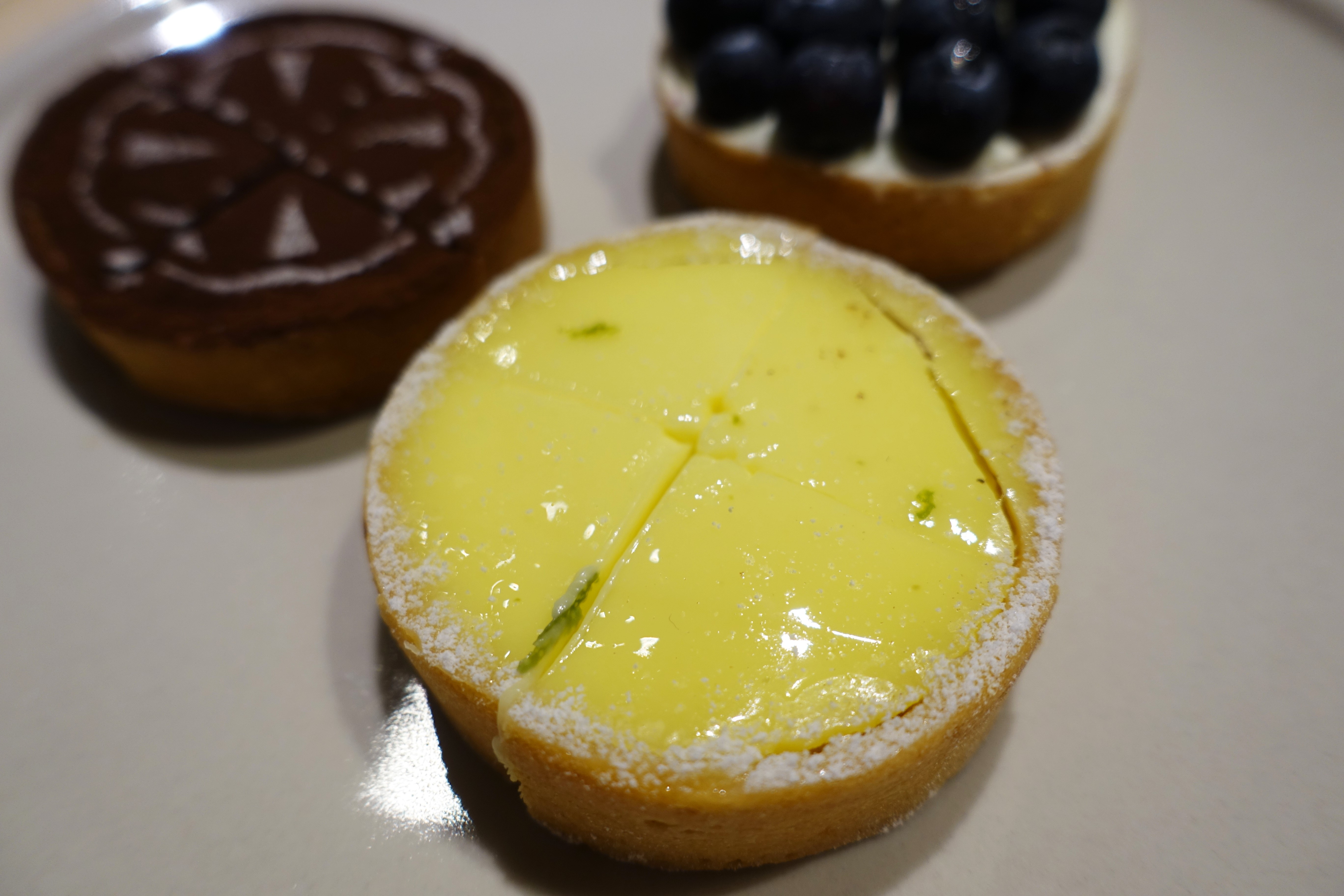 ▼檸檬塔(上)、香蕉巧克力塔(右)與藍莓乳酪塔(下)