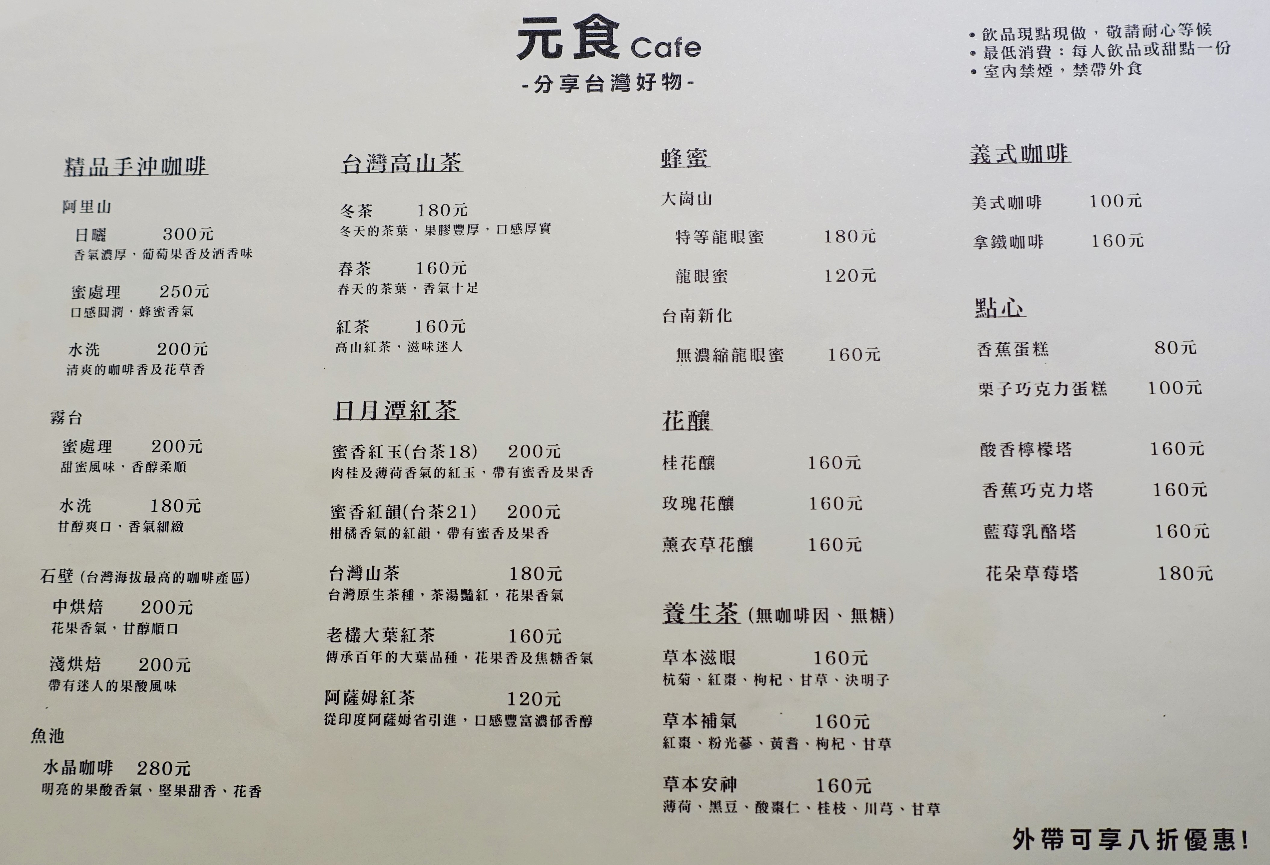 後來,我們又加點了茶飲與甜點,元食的飲品都是台灣本土自產的茶葉,皆是老闆親自走訪產地試喝過,才引進到店裡販售。