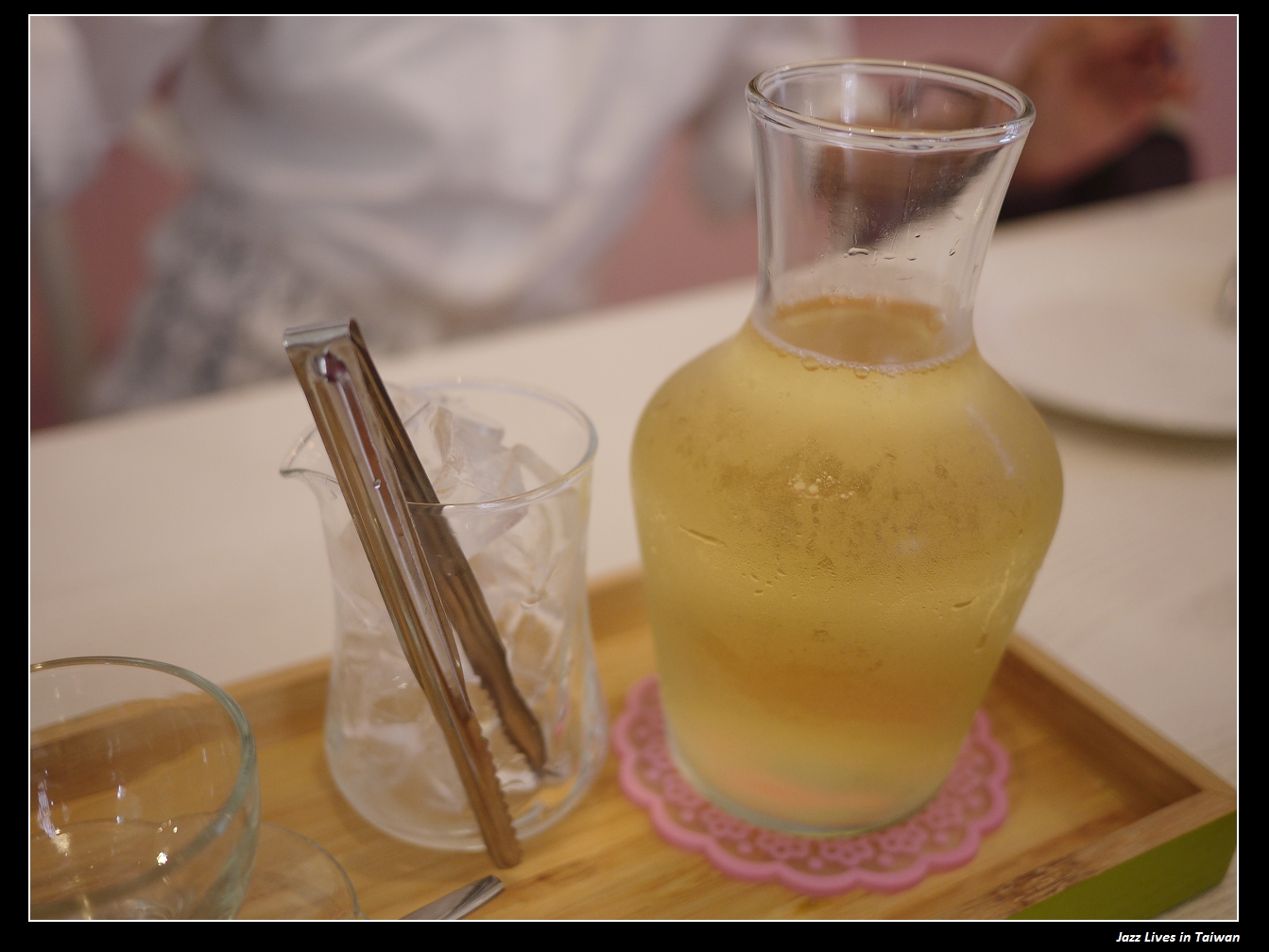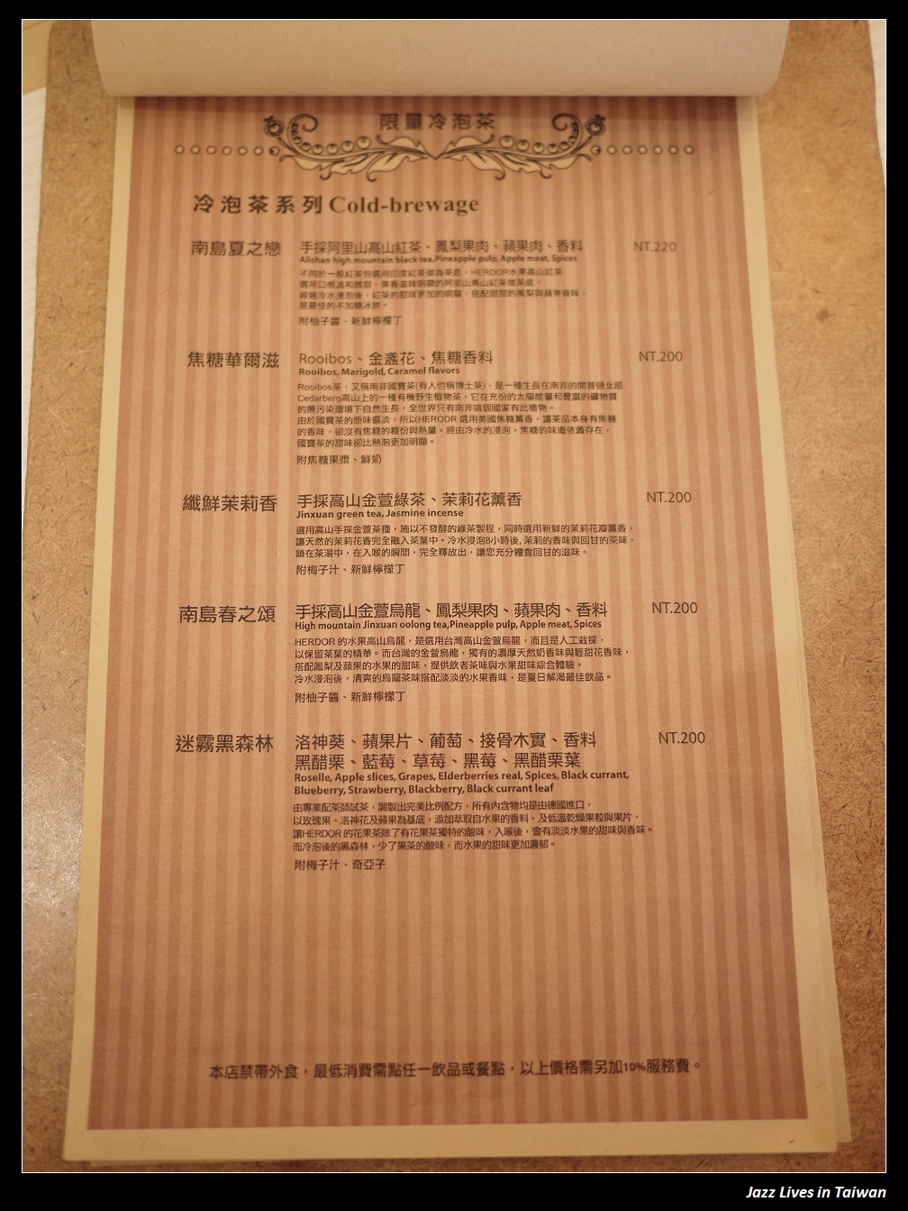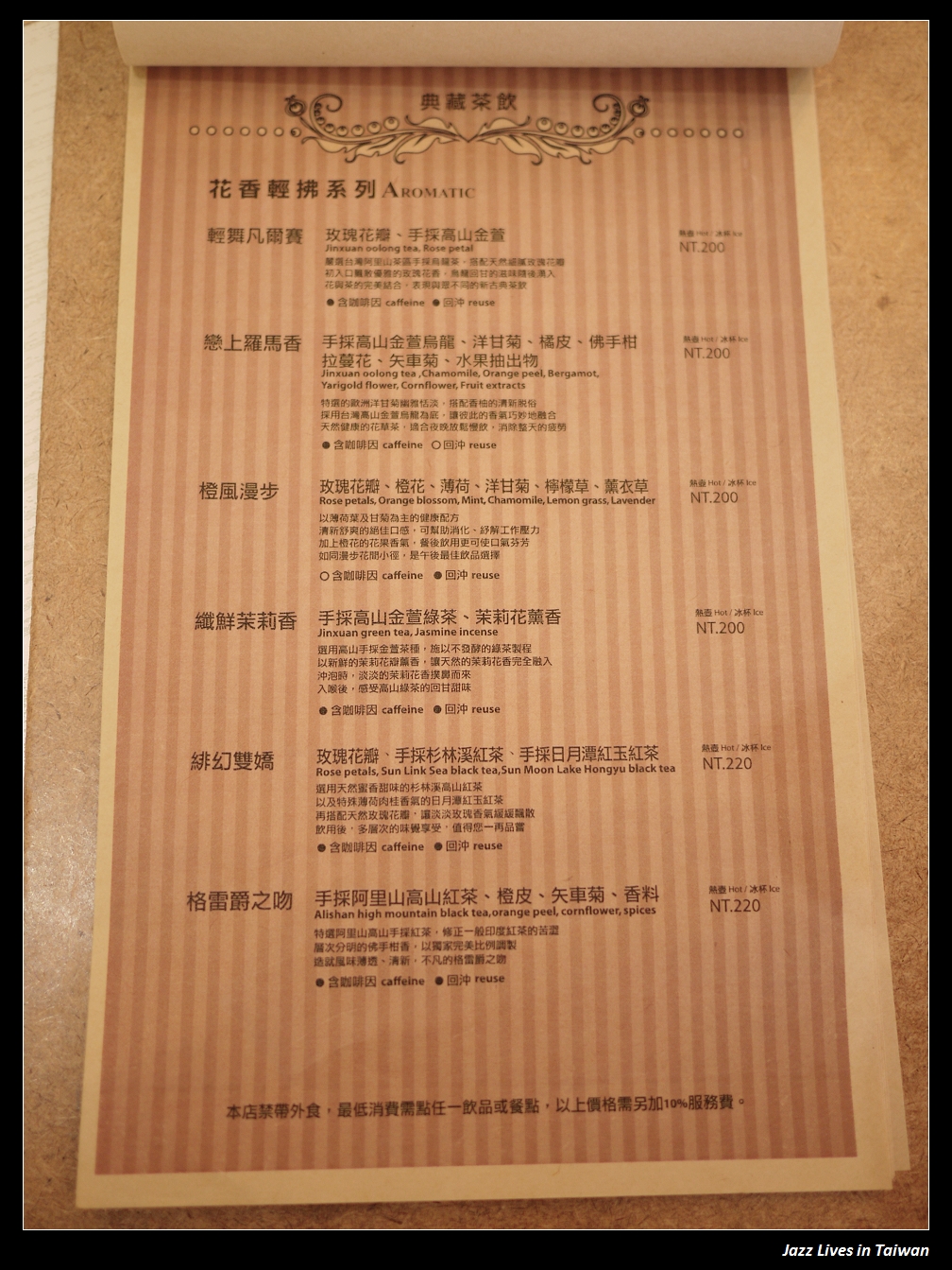 金萱茶種以不發酵的綠茶製成, 同時使用茉莉薰香, 冷水浸泡8小時, 茉莉的香味與回甘的茶味完全釋放, 這是菜單寫的,