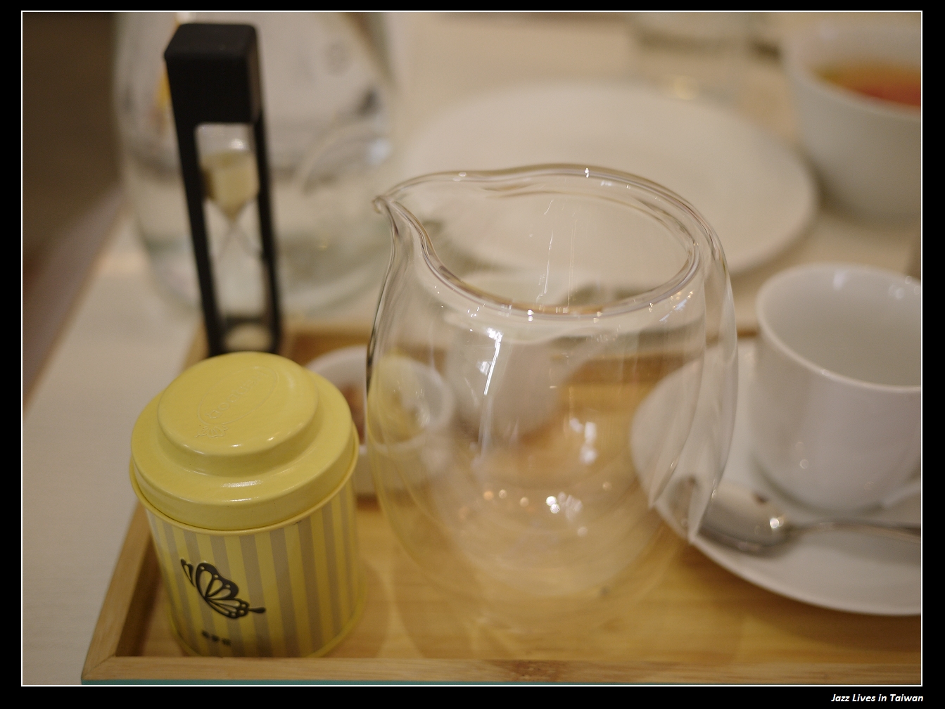 一旁的沙漏是拿來留意泡茶的時間的, 還有一個中空保溫的茶壺是拿來把茶倒出來, 避免泡太久會太濃太澀的,