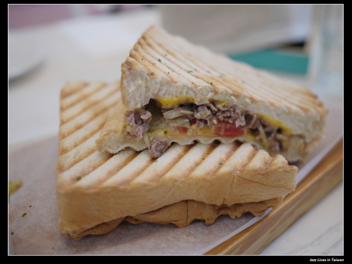黑胡椒牛肉帕尼尼, 洋蔥牛肉搭配奶油與麵包一起壓烤過, 配菜還有一盅的熟食蔬,