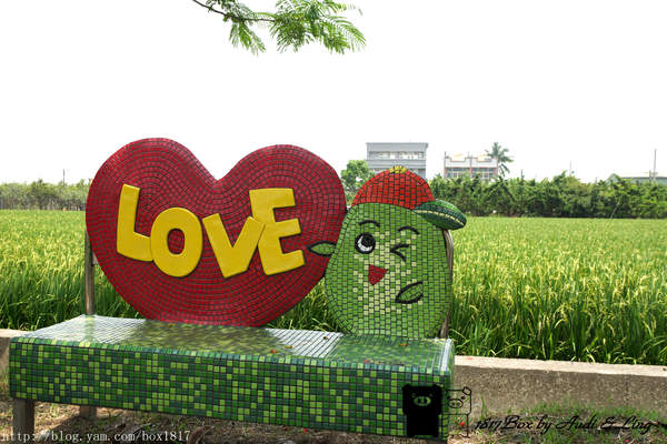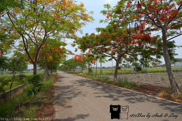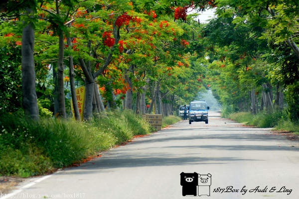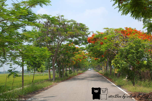 鳳凰花隧道二旁都是綠色的稻田,