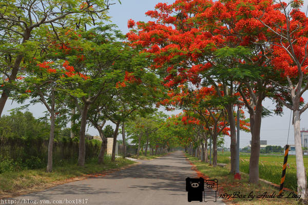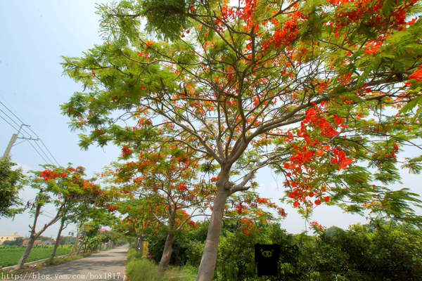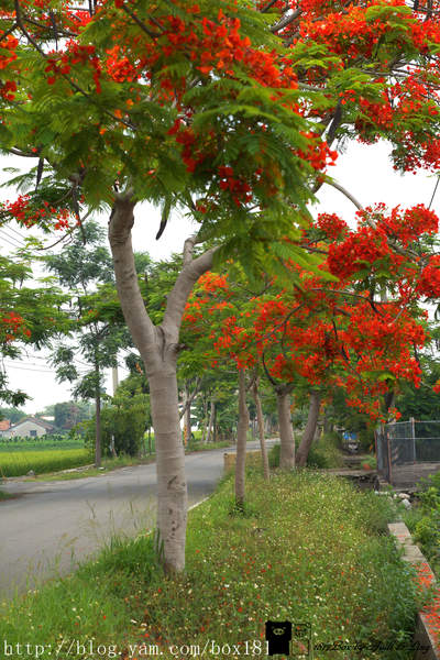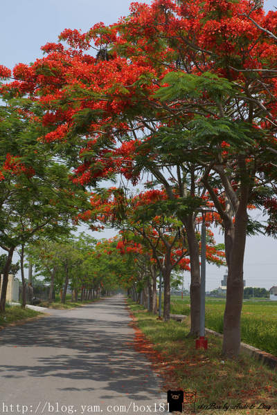 花朵盛開時如豔紅大傘,漫步鳳凰花樹下,欣賞兩旁田地的翠綠稻浪,