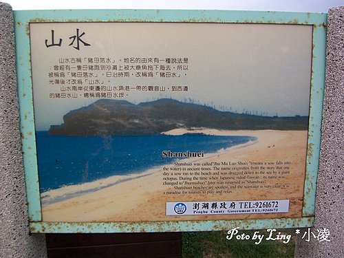 也稱作"豬母水",是以前有人把豬養在海邊,沒想到海中竟出現前所未有的大章魚,將豬拖入海浬,造成豬落水的畫面,因此稱之。但也有另一種說法是山水的山不高,卻有向大海「呼叫」的本事。原來在海岬前端的懸崖底部,數萬年來海水不斷侵蝕,造成許多海蝕洞穴,每逢潮汐漲落,浪濤在穴內與礁石相激,引發洞穴共鳴,而發出像豬群餓索食的號聲。後因名稱不雅,加上海灘風景很美,便改名叫「山水」。