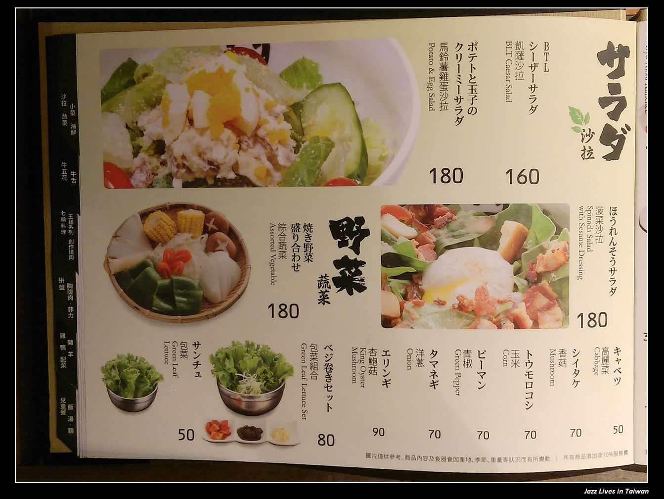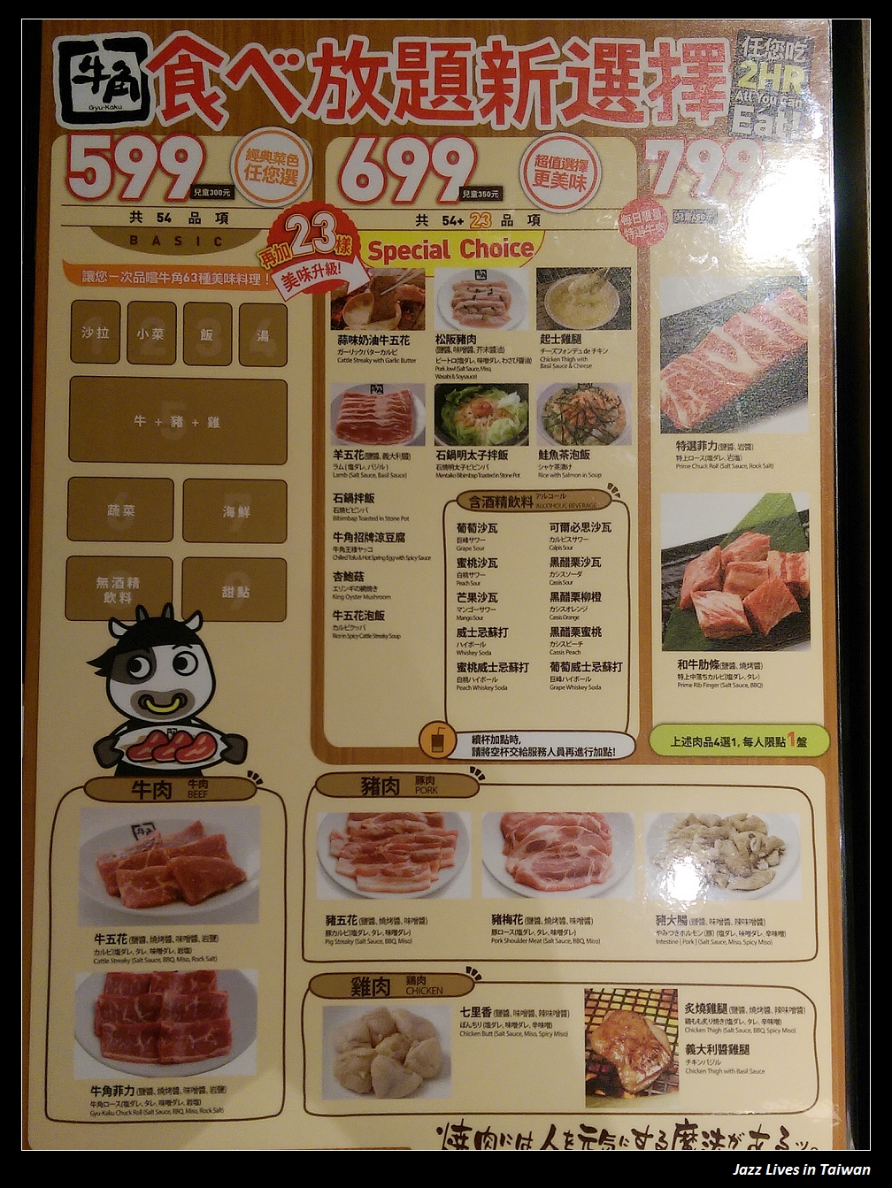 這兒消費方式有三種, 一是單點就是底下菜單上的點什麼付什麼錢, 第二種就是X人套餐, 第三種就是X99吃到飽, 不過吃到飽的不是所有菜色都能選擇, 就只能選擇吃到飽DM上的款式, 大都是基本款的肉類, 有點少...