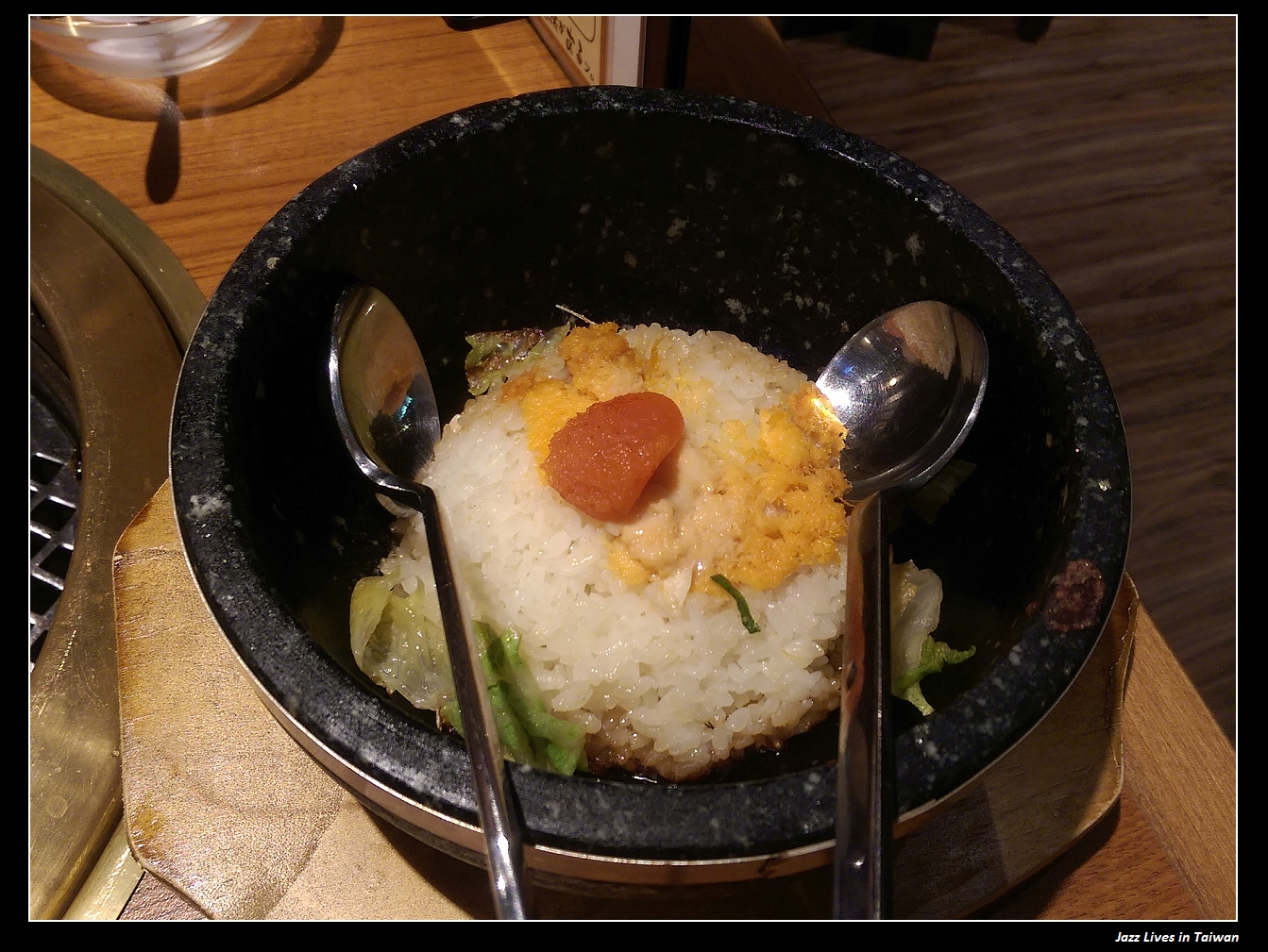 石鍋明太子拌飯, 最多大約只能分出3~4碗, 分到最後看到今日的主角沒飯吃, 啃著湯匙上的飯粒, 卻不願再加點...V__V