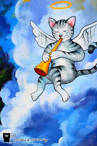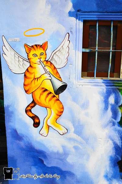愛的貓天使,讓人莞爾;再往前出現一座以貓為造型的小公園,提供休憩的場所,再隔幾間老房子,一隻金