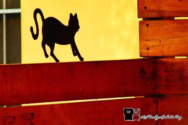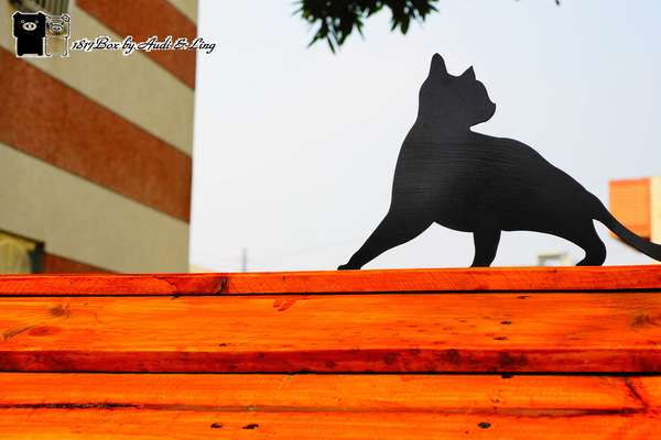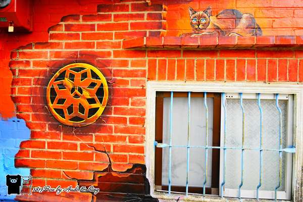 屬貓駐足圍牆上,守護著家園,社區就像大繪本,充滿趣味、輕鬆。