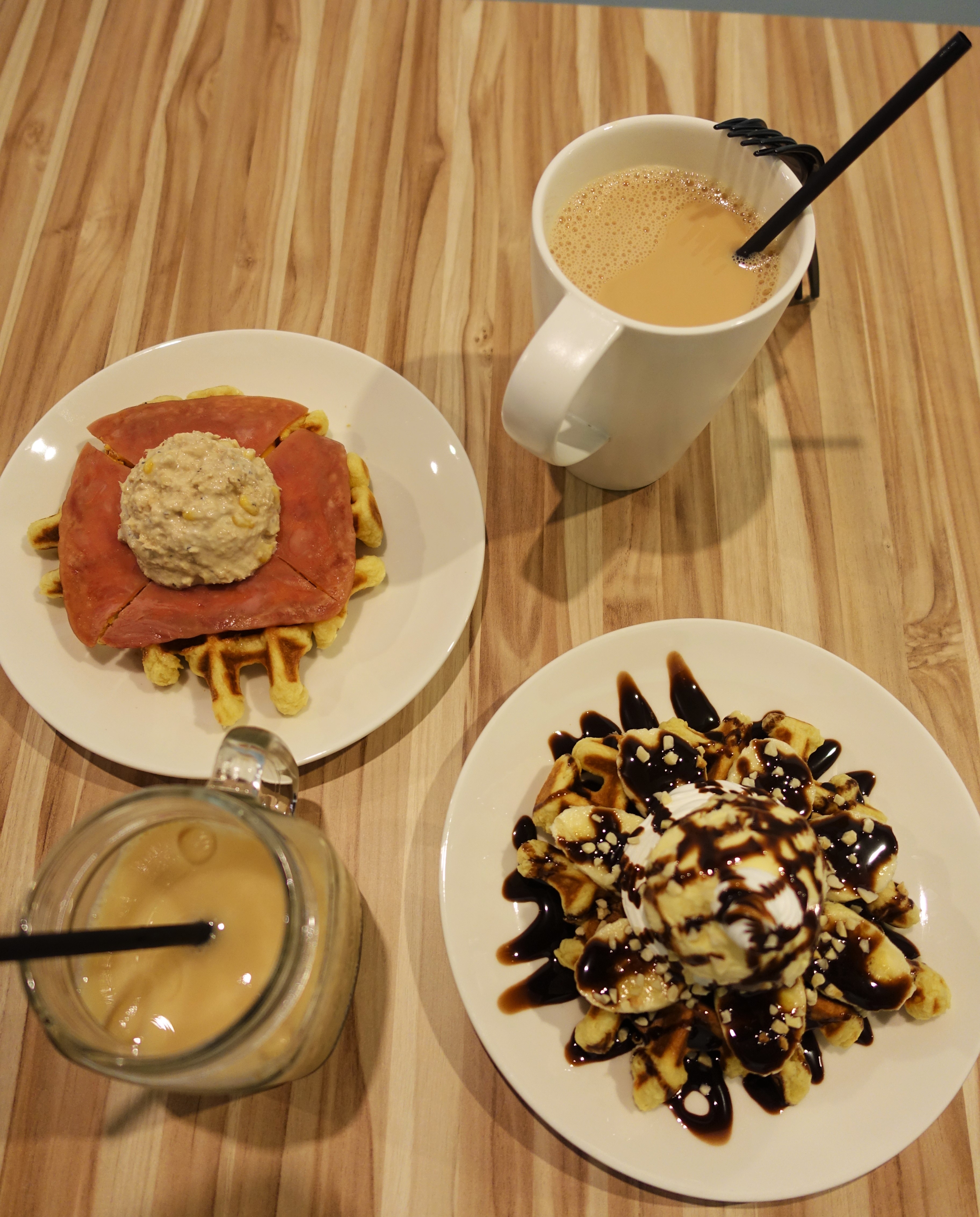 當天我們點了甜與鹹鬆餅各一,外加兩杯飲料。鬆餅部份我們挑了排行榜的香蕉巧醬冰淇淋鬆餅與總匯鬆餅,飲料則是溫鮮奶茶與冰榛果鮮奶茶。
