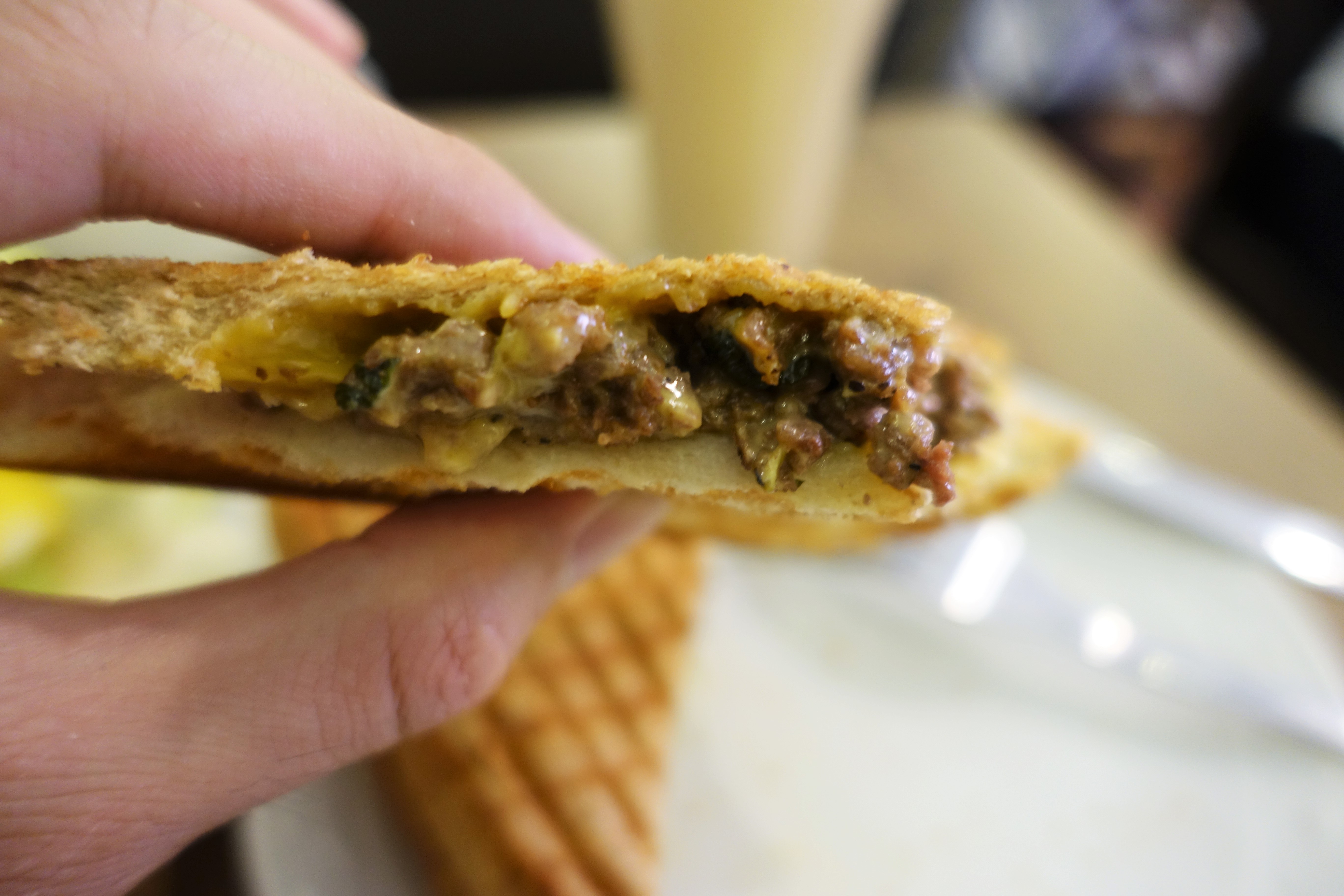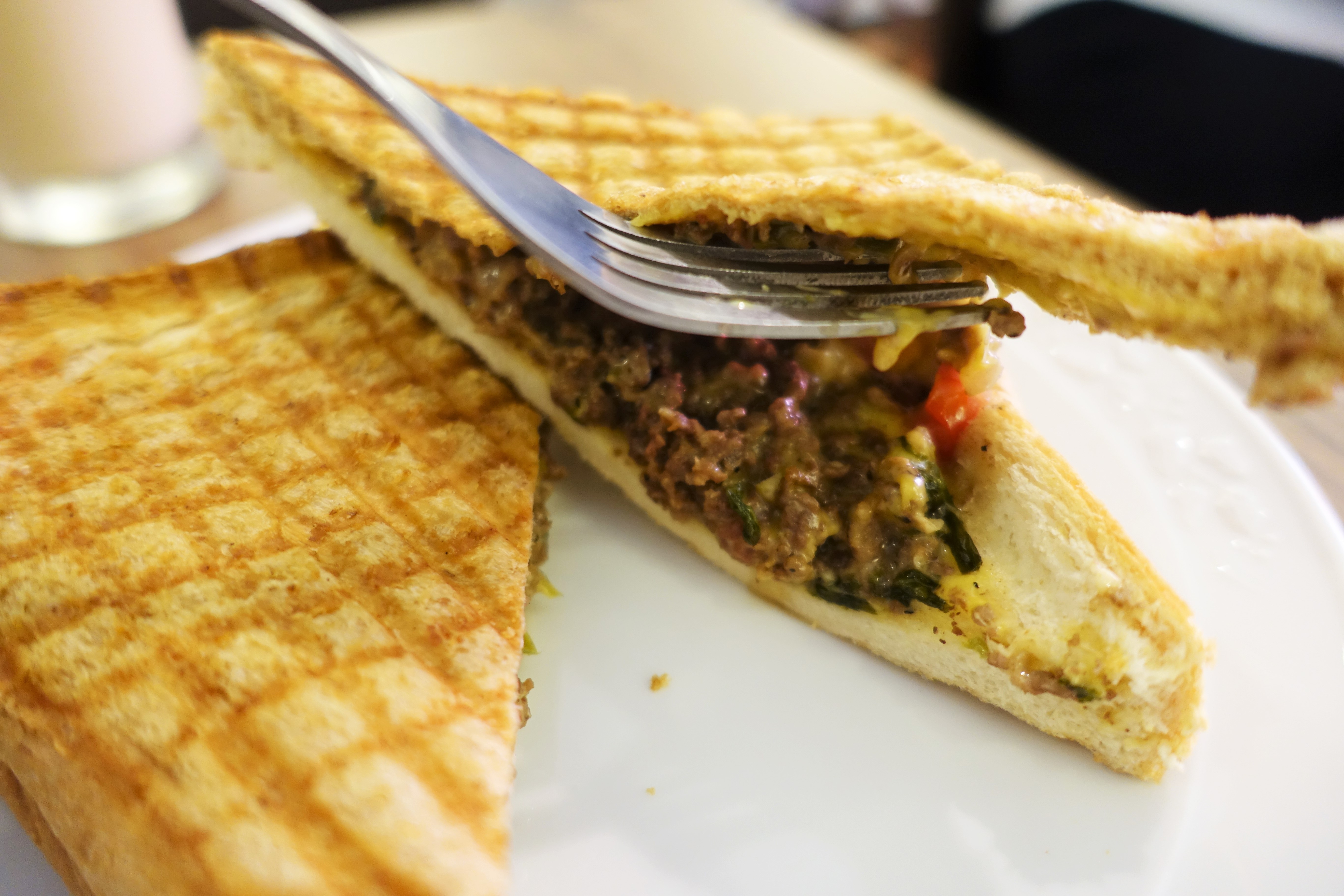 這道羅勒牛肉帕尼尼一入口馬上感受到碳烤土司酥酥脆脆的口感,隨後一股到淡淡的鹹味會跑出來,可以吃出是牛肉而非鹽或味精的味道,而且因為有加九層塔,讓牛肉的味道更顯出色。