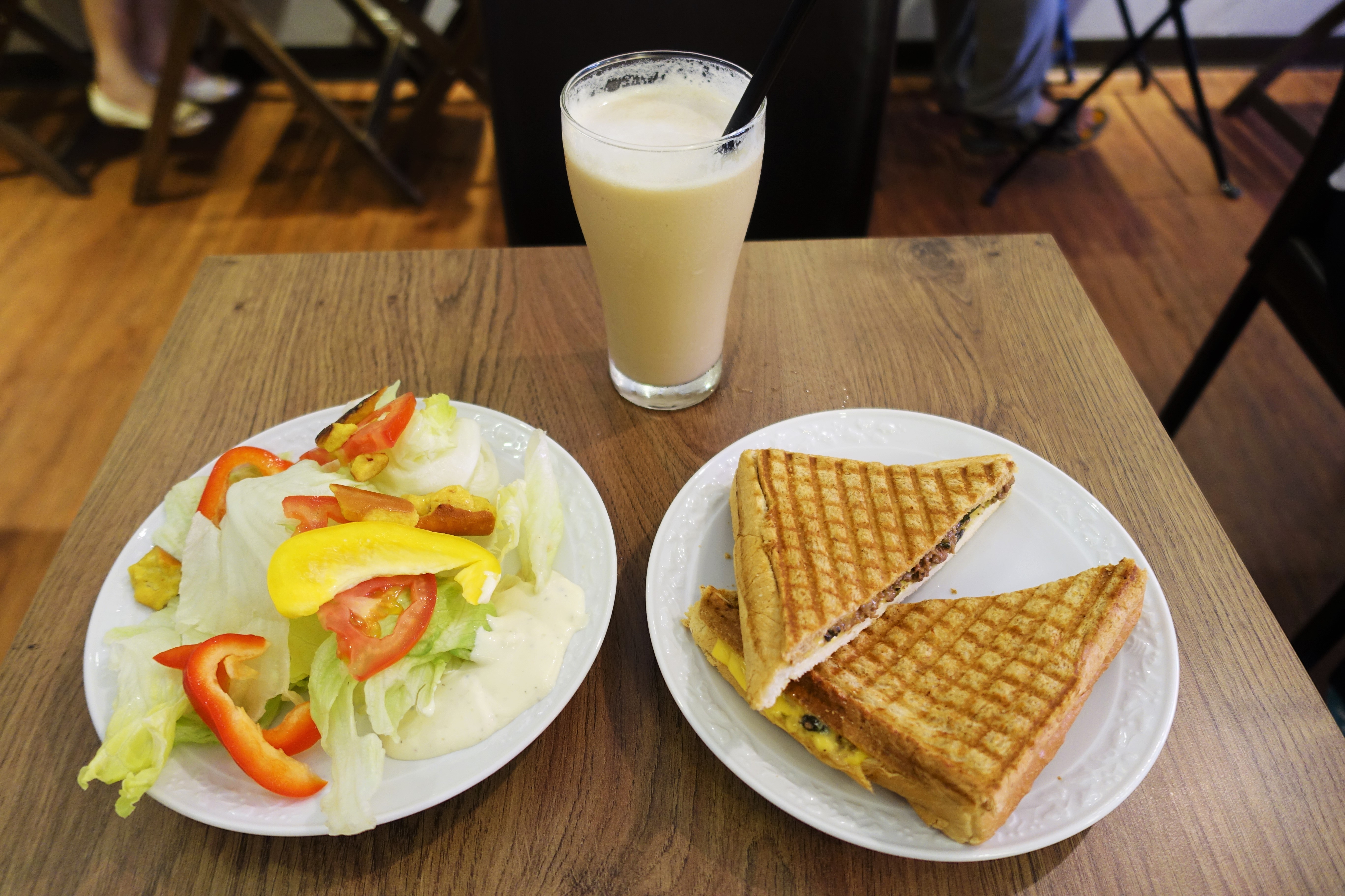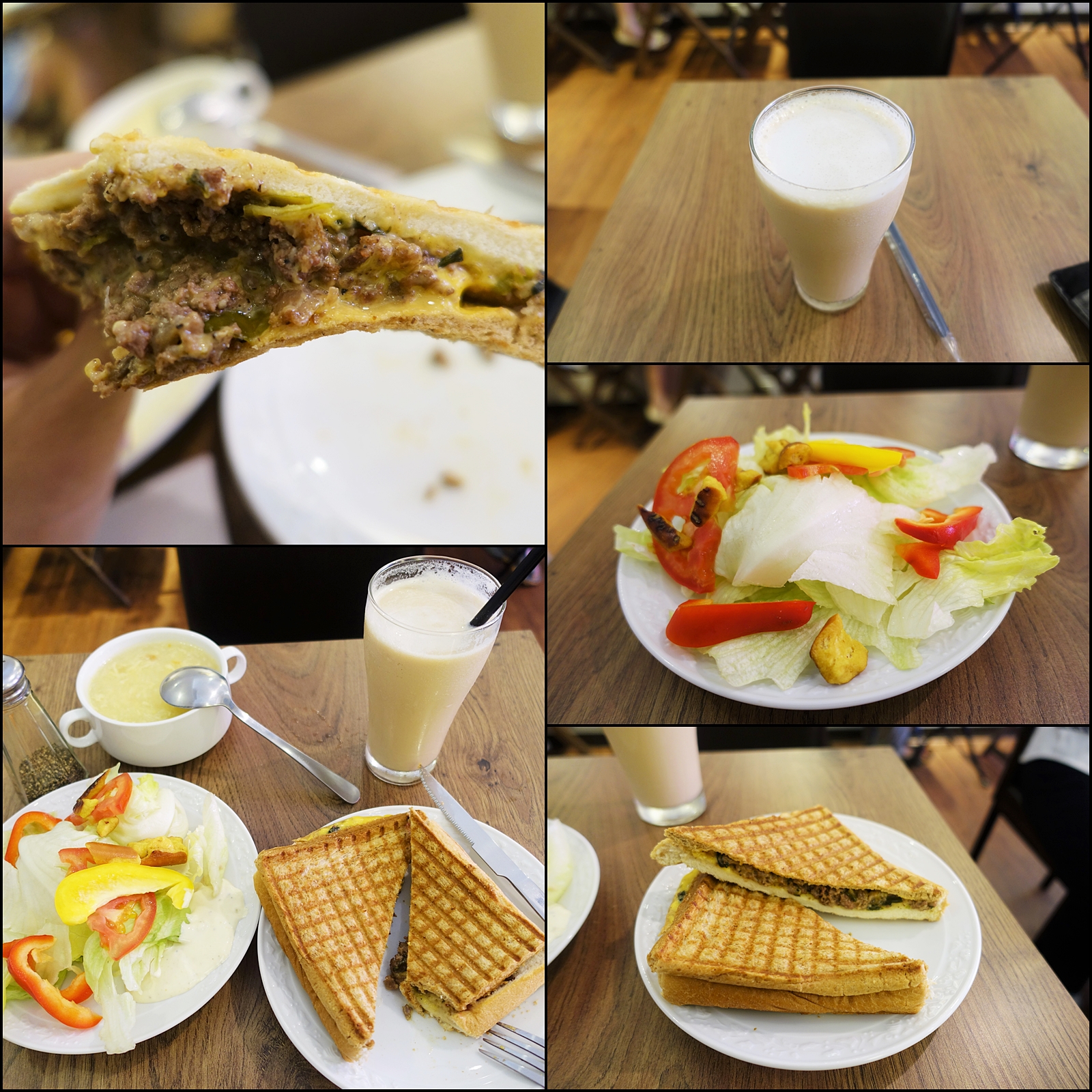 當天我選了羅勒牛肉起司帕尼尼($100),加80元升級,選了沙拉與鮮奶茶(補差價$10),因為被認出第二次來,招待了湯給我XD
