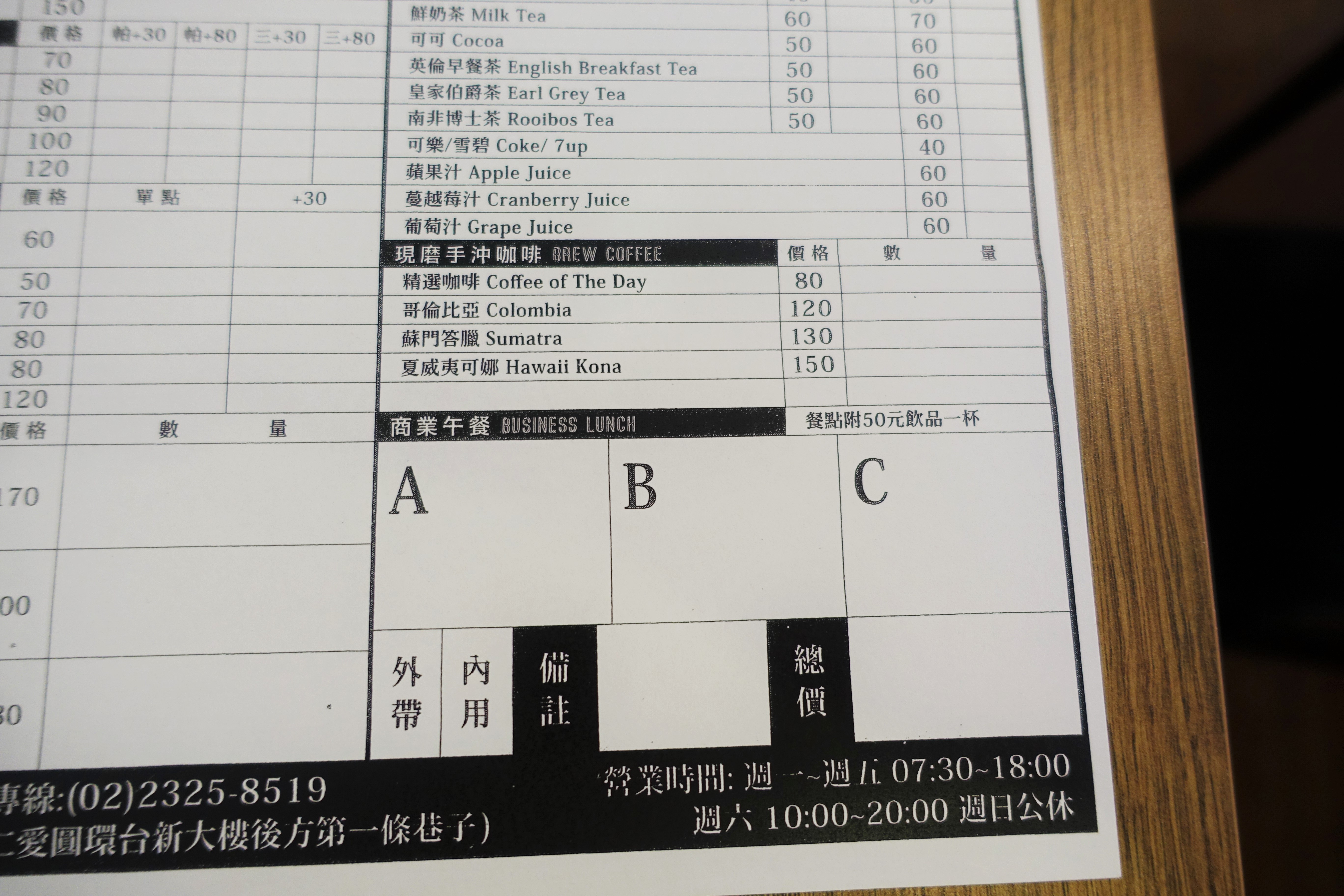 如果要吃商業午餐請先看完入口小黑板或詢問店家,再依據想吃的餐點勾選ABC,並任選50元飲料。