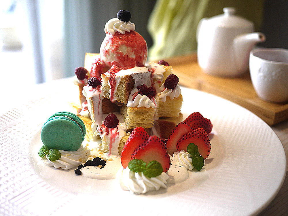 法老金字塔,一種唯美的象徵,搭配少女最愛的草莓與馬卡龍,吐司則是用丹麥吐司堆疊,結果我才拍完還沒吃到,這盤就被大家掃空了,到底.....到底....是怎樣啦!超暢銷的!