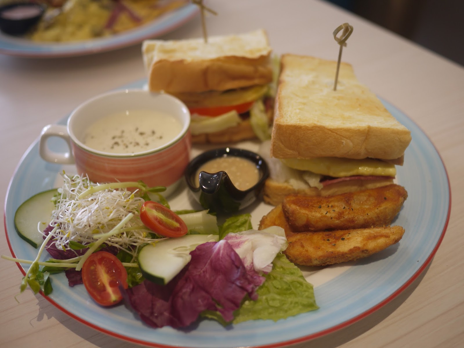 Lazy sun 特製早午餐,這一道因有香菇我不能吃,裡面有可頌、野菇炒蛋、火腿、起司、沙拉、濃湯,搭配的是藍莓口味的沙拉醬,朋友說吃得很清爽。