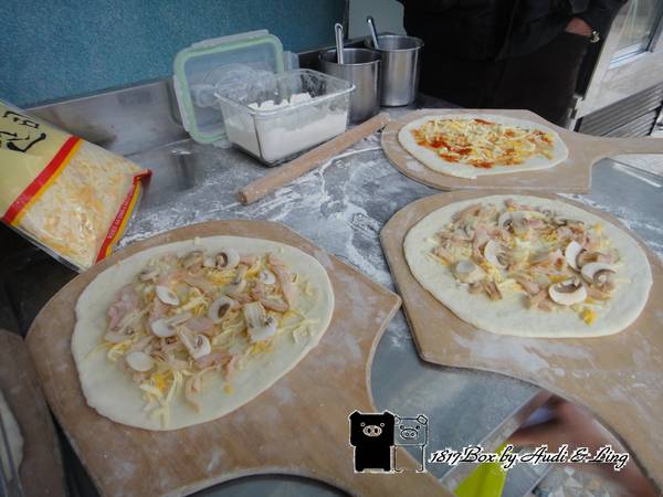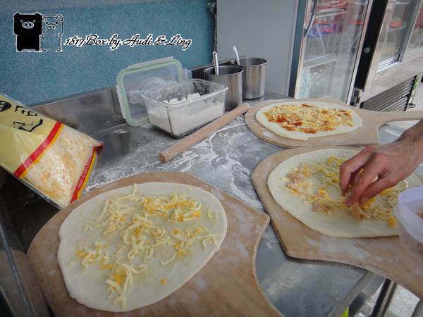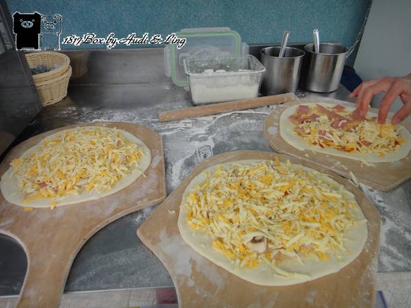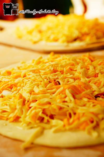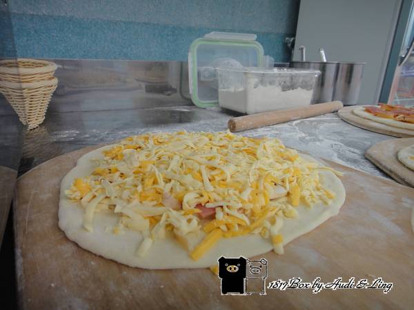 麵皮先放好.然後桿平. 放上果醬.再鋪上要吃的食材. 最重要的是乳酪絲(起司)要鋪上厚厚一層