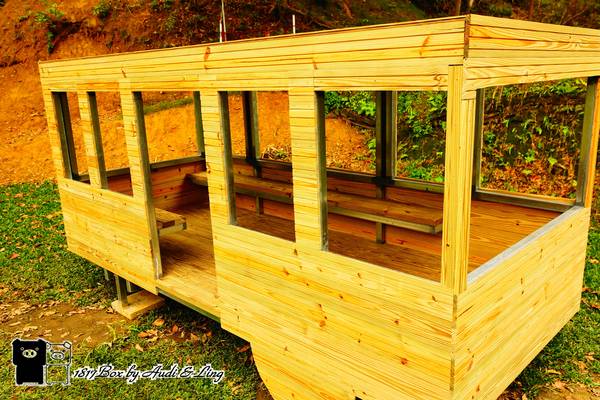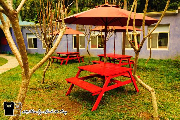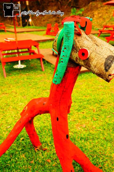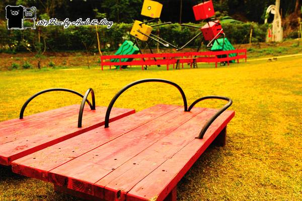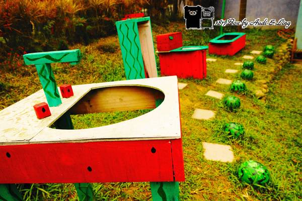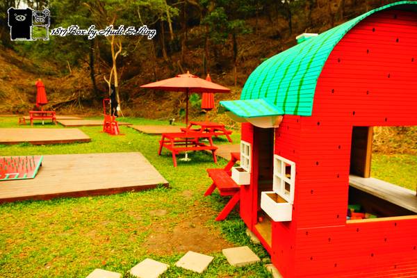 戶外區有擺設野餐桌椅. 一片草皮. 幾個小屋都放有小朋友可玩的小玩具. 積木..等