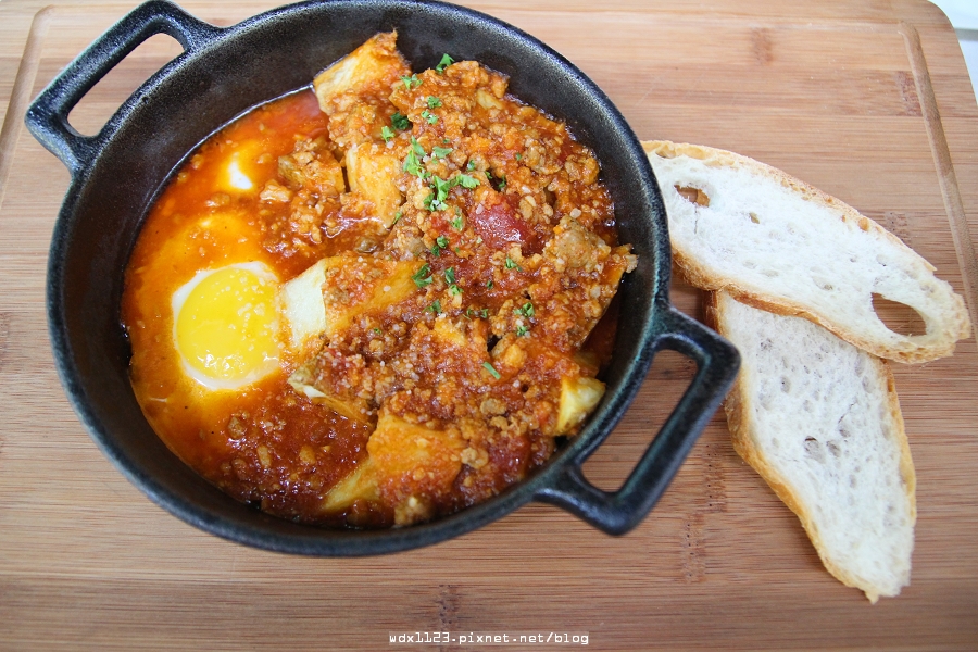 馬鈴薯是先蒸再烤的方式製作,接著打上一顆蛋後淋上肉醬,