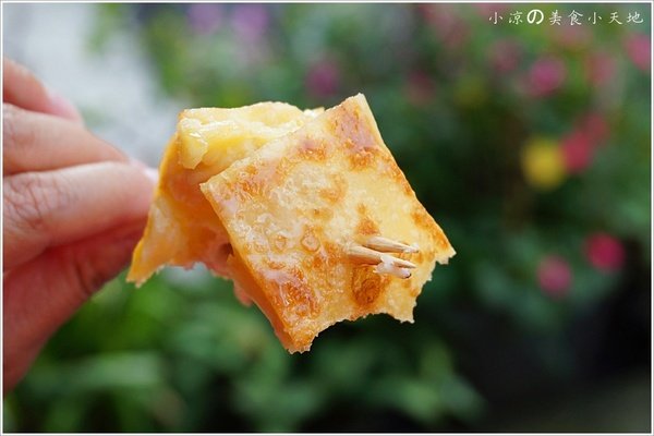 並將四邊餅皮往中間包覆慢慢摺成四方形,讓它雙面慢慢煎熟...