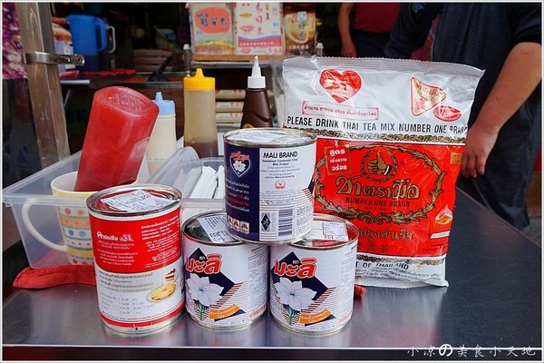 攤車旁擺著泰國進口來的原物料,煎餅粉,煉乳和泰式茶等等...