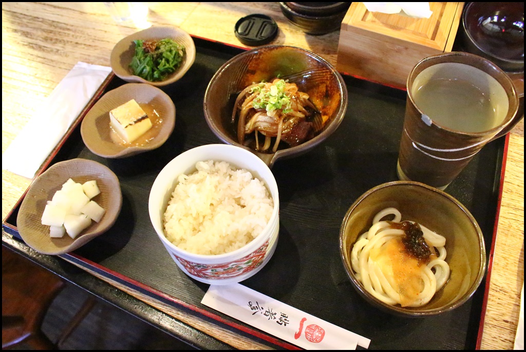 不久,我的牛小排定食來了,有兩種小菜、一盤醃漬的蘿蔔、主菜、白飯、小烏龍麵,