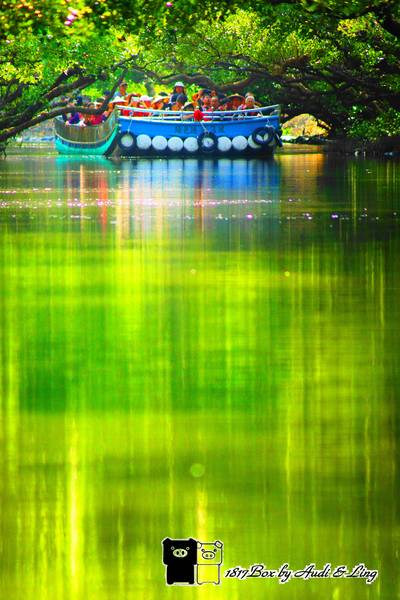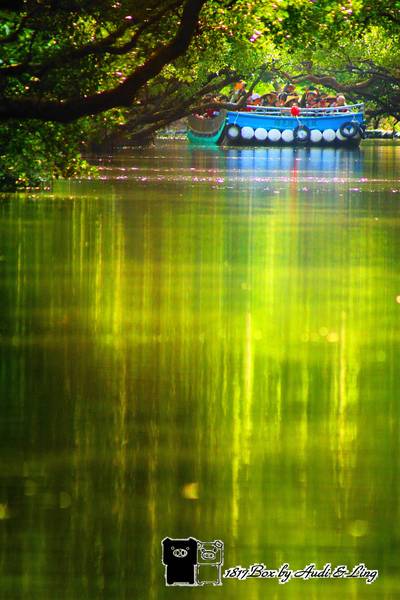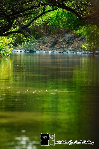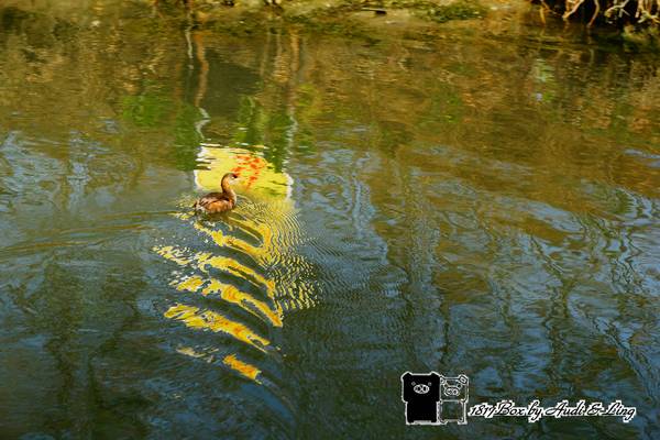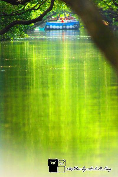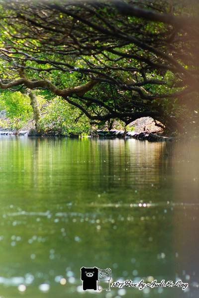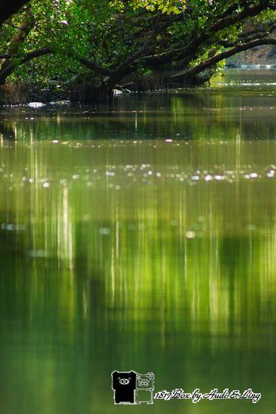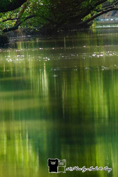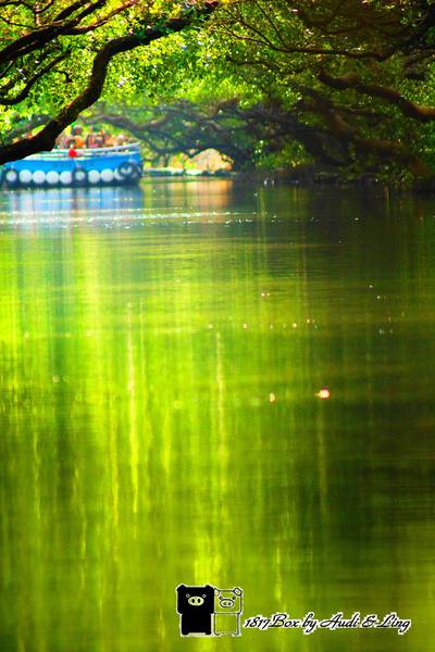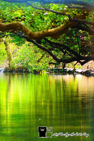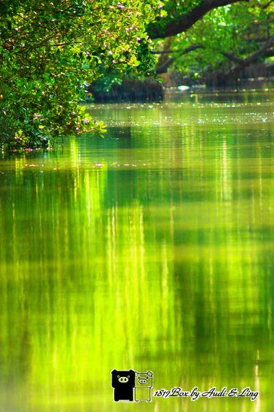 及陽光經枝葉的縫隙中灑落在水面,波光粼粼與綠樹倒影的交錯,好不感動啊!