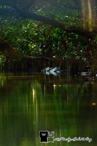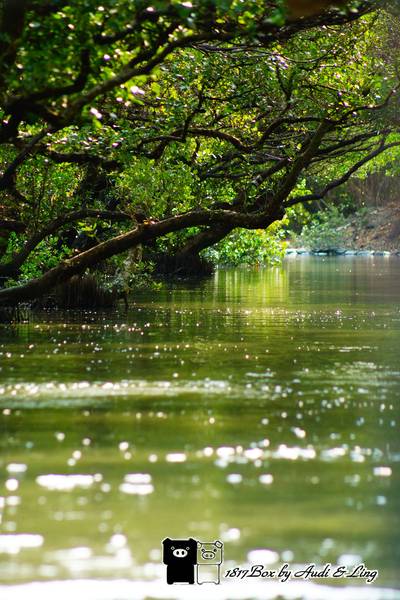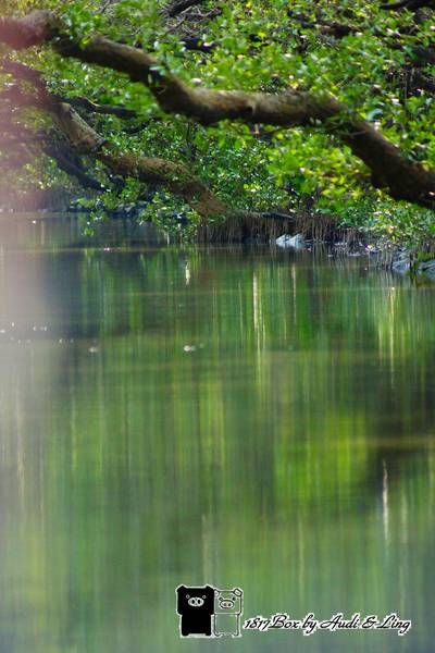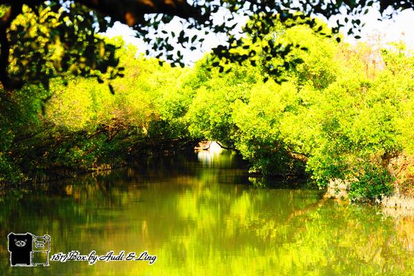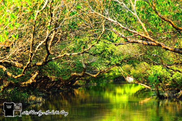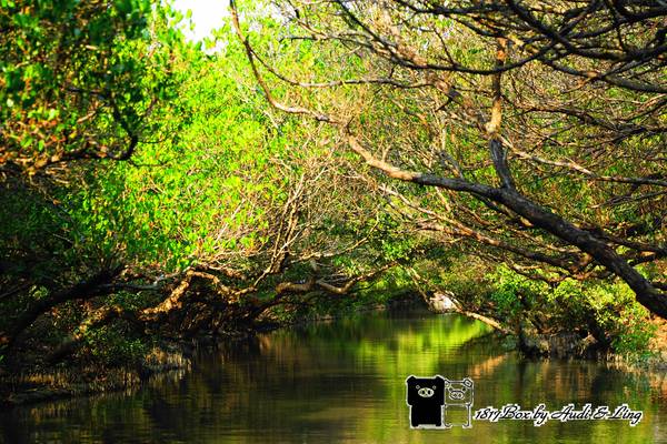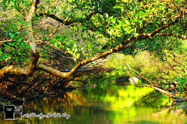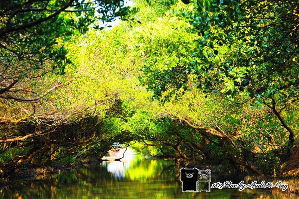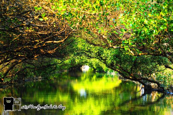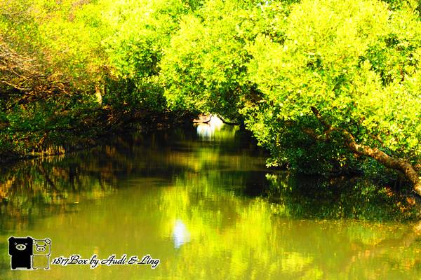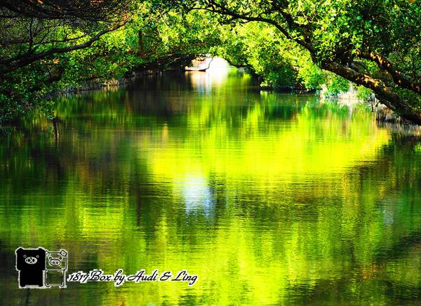 陽光穿透紅樹林. 灑在河道上. 河裡綠波倒影與綠色隧道形成一幅幅美麗的畫面