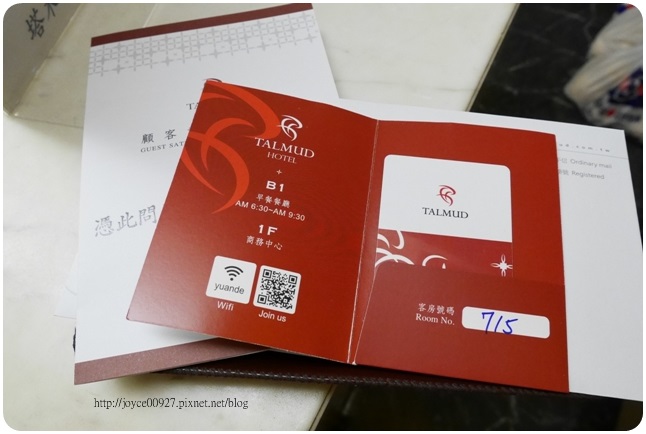 上面有房號、無線上網的wifi密碼、早餐餐廳的樓層和用餐時間