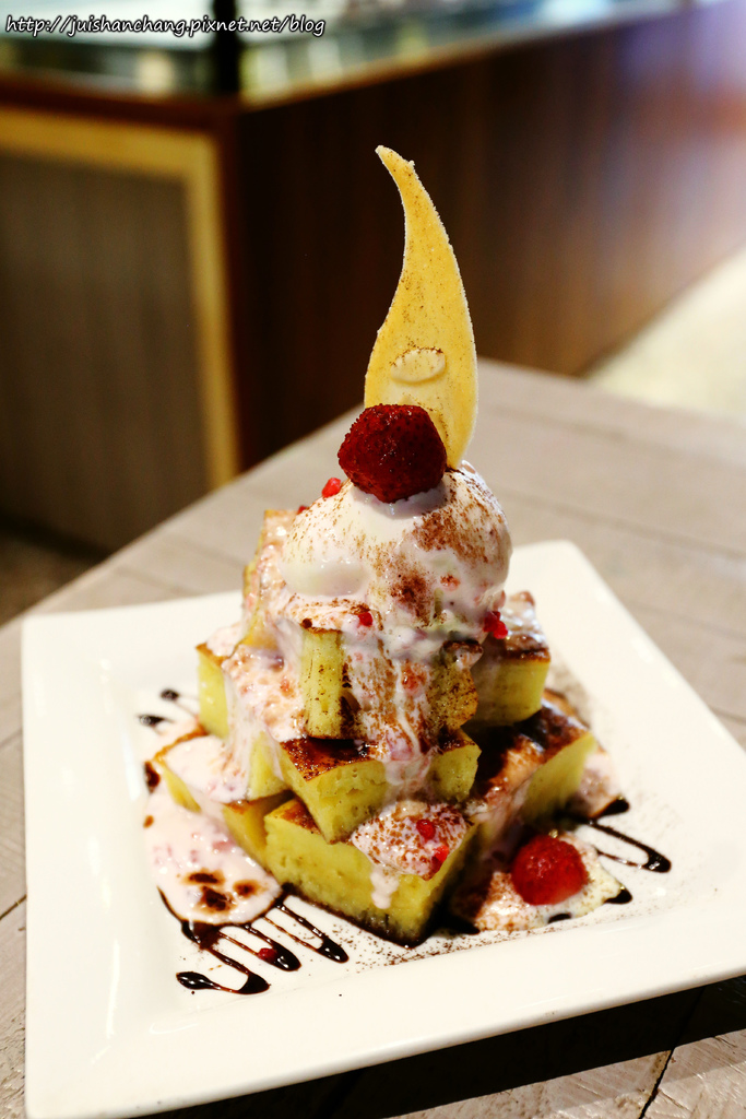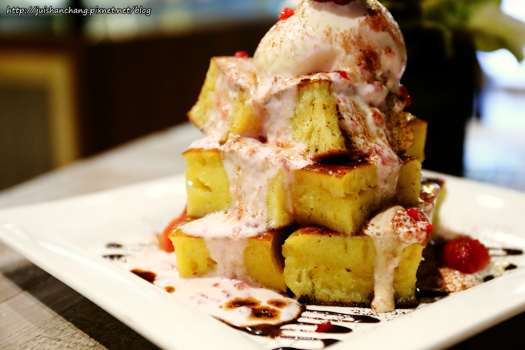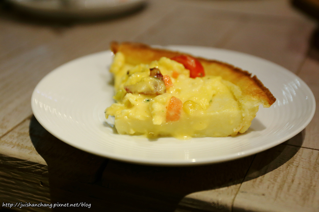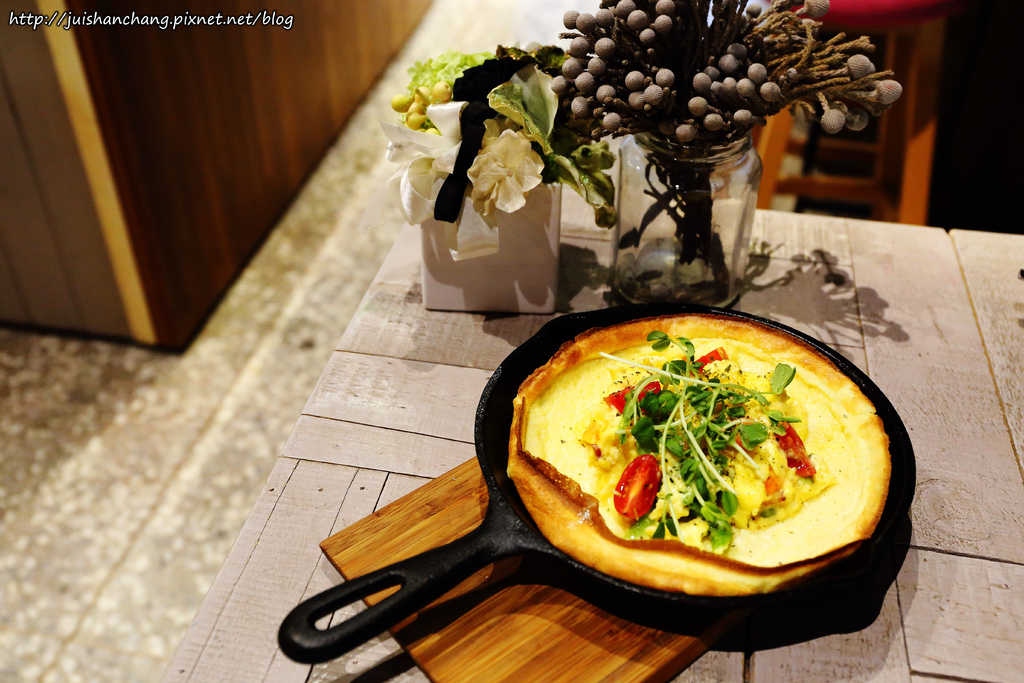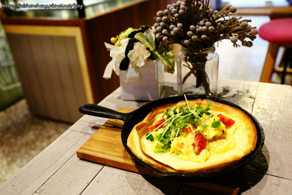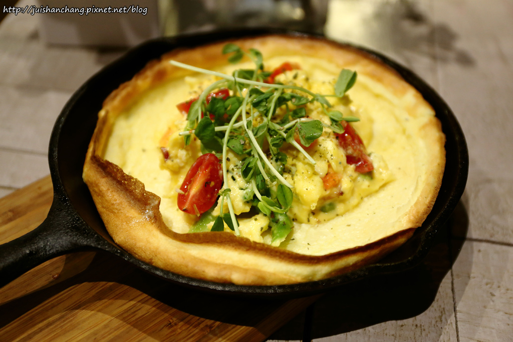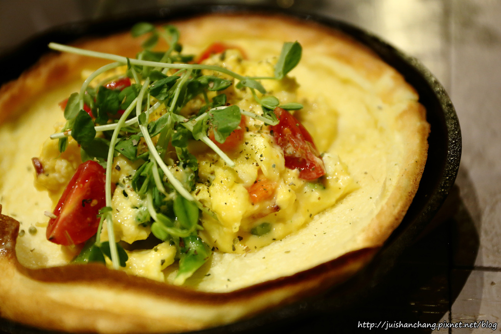 跟一般的格子鬆餅or扁圓狀Pancake不同,這兒的德式煎餅上面舖滿著大量炒蛋與帕馬森起司,充滿了奶油及雞蛋的香氣以及淡淡的甜味,有點像是在吃有厚度的蛋皮,而蓬鬆度吃起來有點像是鬆餅加上布丁的感覺