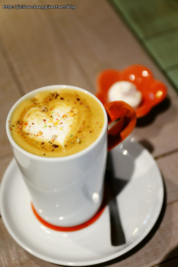 用白巧克力,搭配香濃的咖啡和牛奶,最後再厚實的奶泡上灑上白巧克力碎片,一邊喝一邊轉動杯子,讓每一口都喝得到白巧克力摩卡的滋味,更吃得到融化在咖啡裡的白巧克力碎片,滋味真的好得沒話說。
