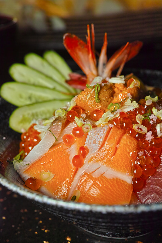 材料眾多, 三色常見的魚, 再加上鮭魚卵和宜蘭紅甜蝦以及干貝, 玉子燒, 當然, 頂上的馬糞海膽也好