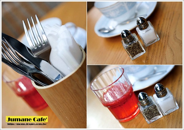 | | 點好餐後服務人員就會送上餐具和超可愛的調味罐… 接著也會先送上餐前果汁讓客人先行享用… |