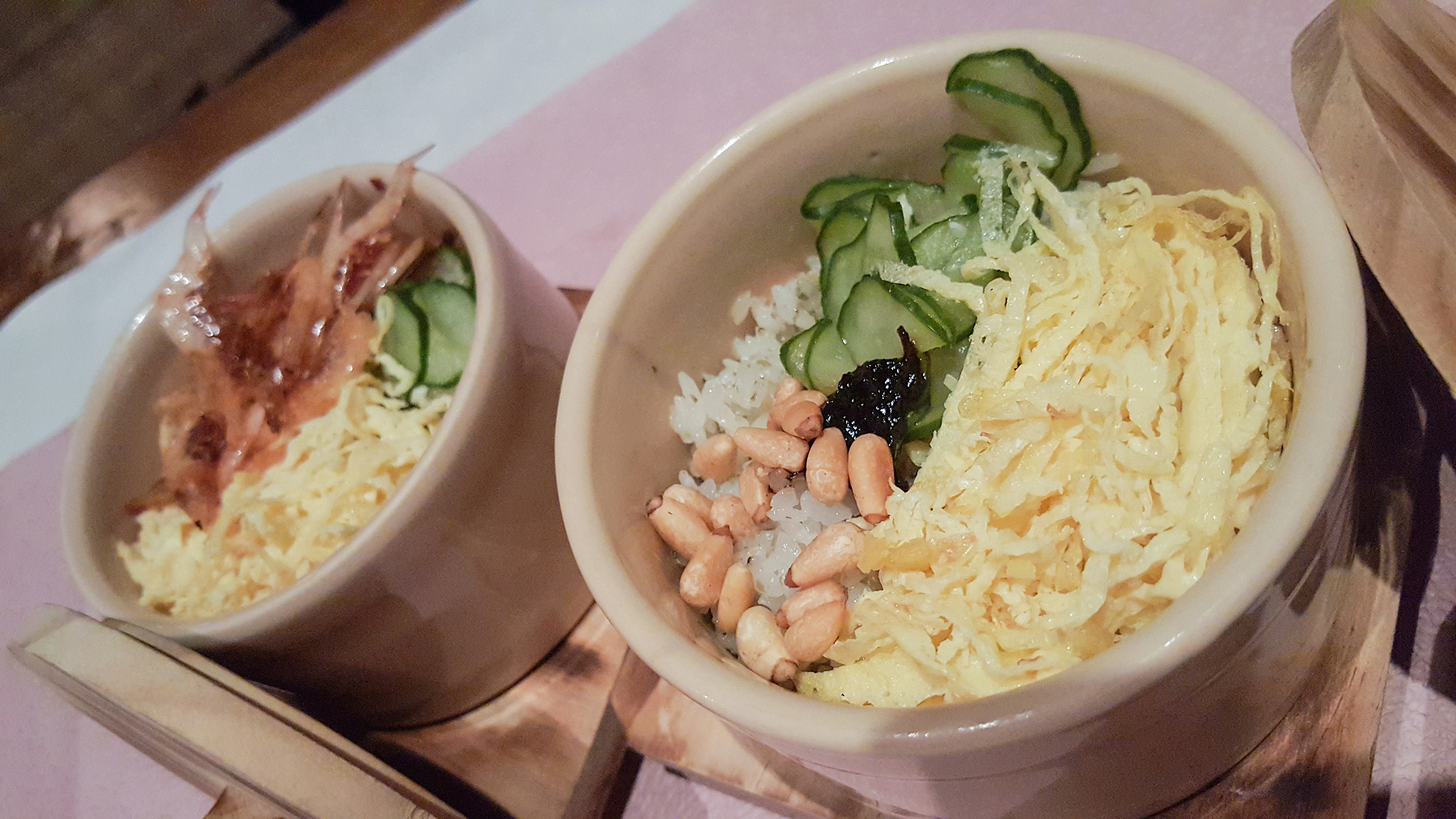 【葷食:櫻花蝦蒸飯 素食:海苔松子蒸飯 味道很香,米粒微硬增添口感,小黃瓜為酷夏帶來清爽解膩】