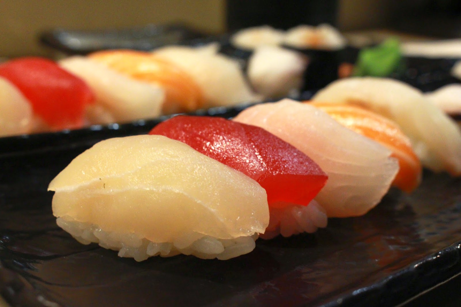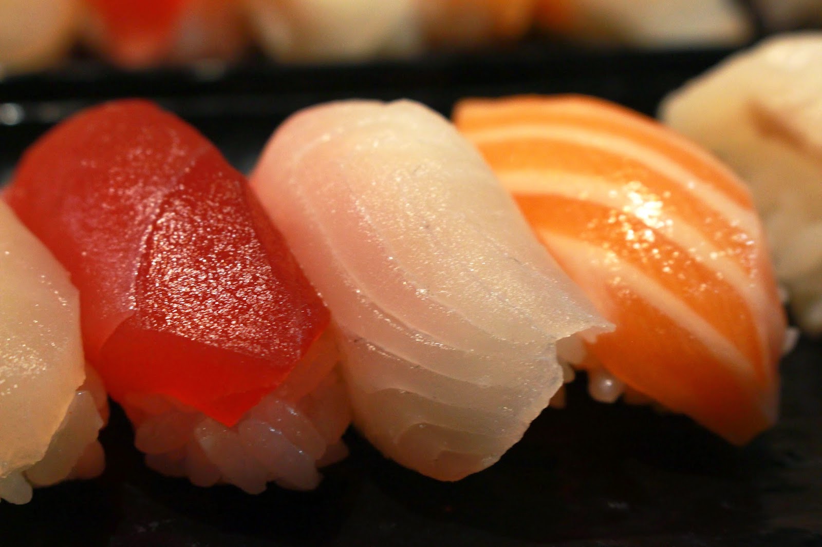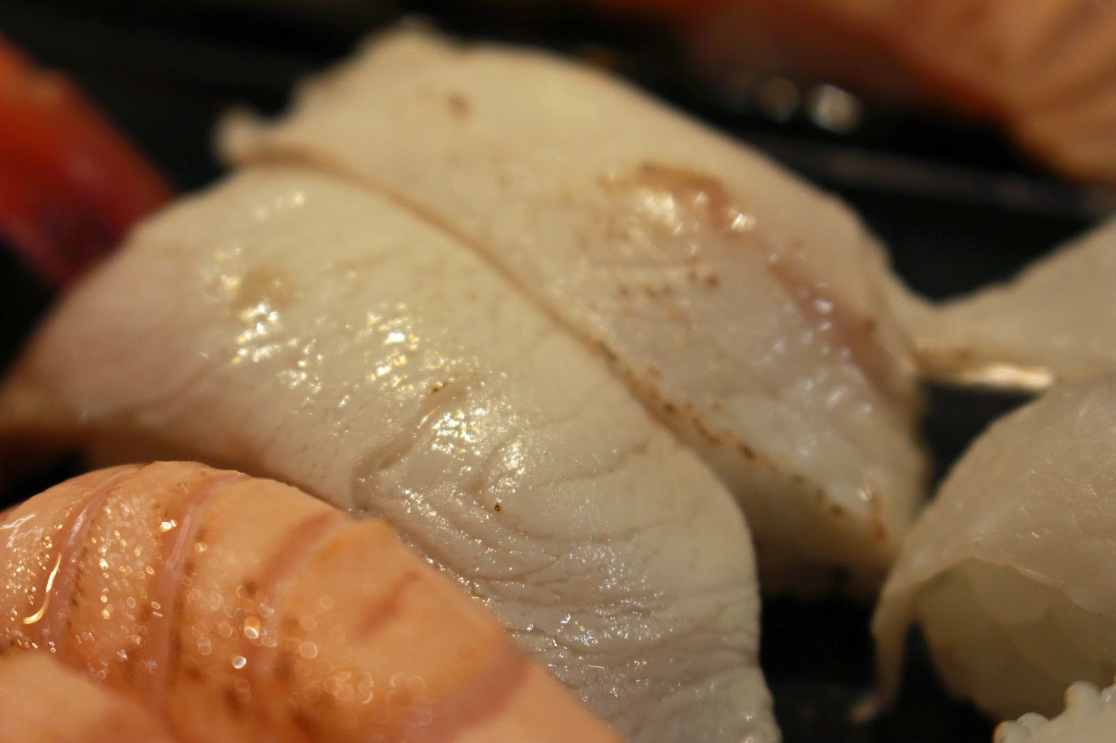 由右至左分別是綜合壽司.章魚.旗魚.鮭魚.海鱺魚.鮪魚.鯛魚