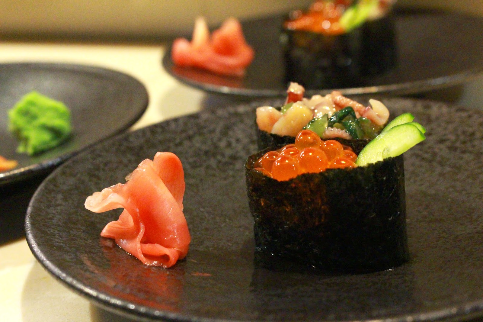 灑滿鮭魚卵的壽司晶瑩剔透在燈光的照耀下更顯透亮