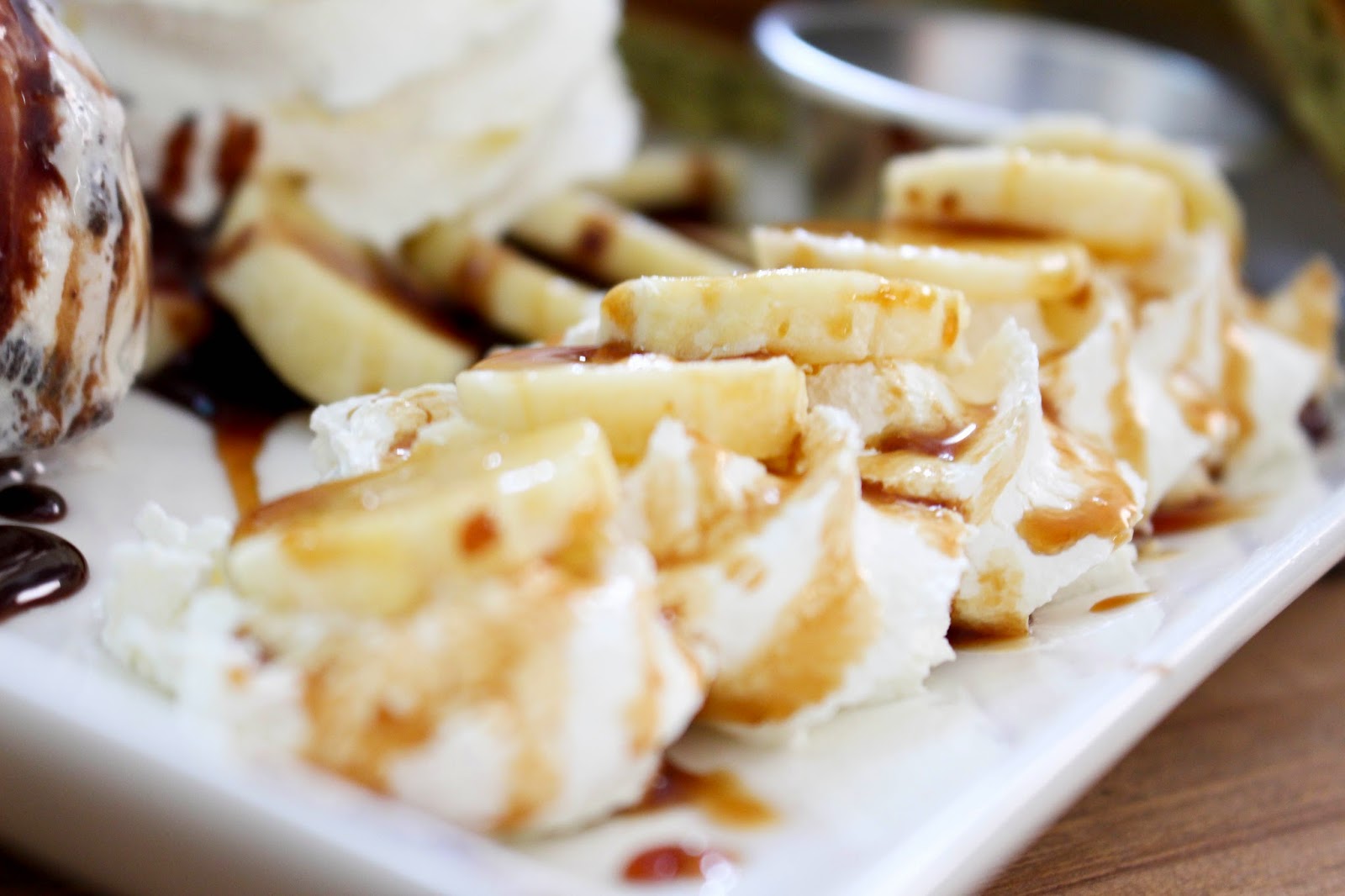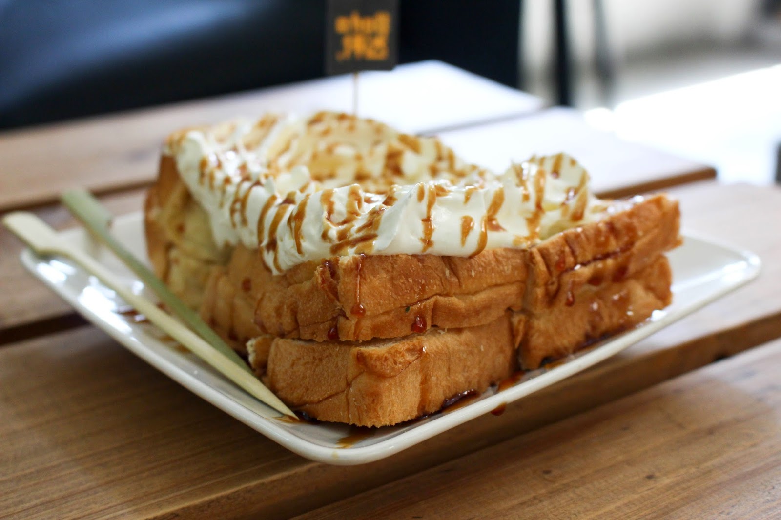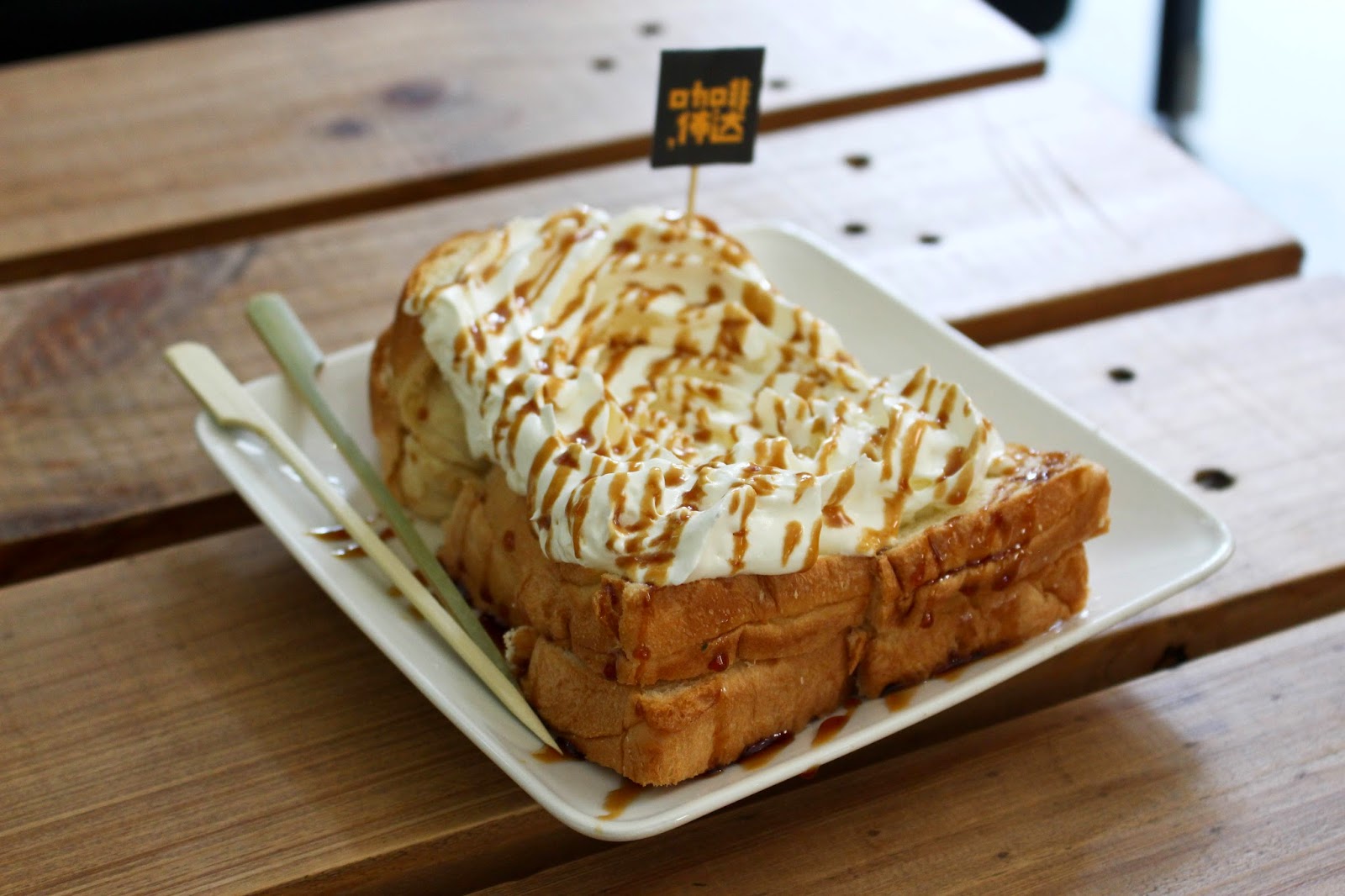 烤的酥酥的吐司擠上滿滿的鮮奶油淋上焦糖插上佈達咖啡的旗子