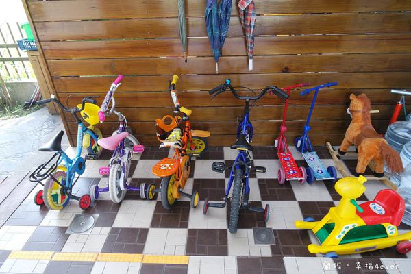 有幾台小朋友騎的腳踏車、滑板車,民宿也有提供親子腳踏車可騎,可惜現在太陽一出來就熱翻了,不然真的可以騎到附近晃晃
