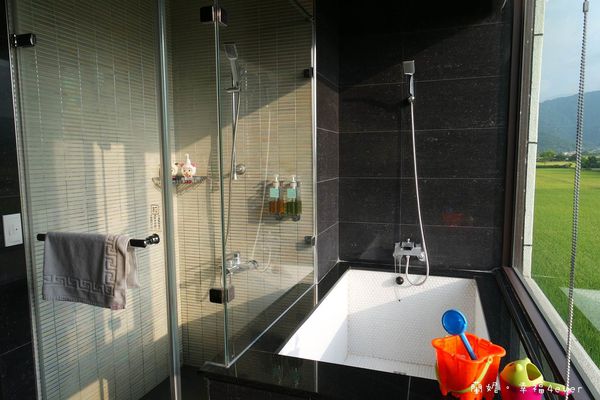 乾濕分離的衛浴,白天窗簾外是綠油油的稻田