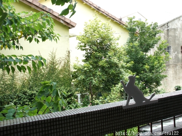 肆号寓所正對路中央,門口綠色的小黑板,寫著7/1至8/2客家桐花花布展,好奇地,伸進了頭打量這間有家的味道的庭園,牆面上斑駁的落漆,道盡了歲月的刻痕,古樣地木製窗櫺上,客家花布帶出了客家文物的特色,牆頭上、窗邊活龍活現的貓咪看板,可愛的模樣,在綠蔭中更顯生動。