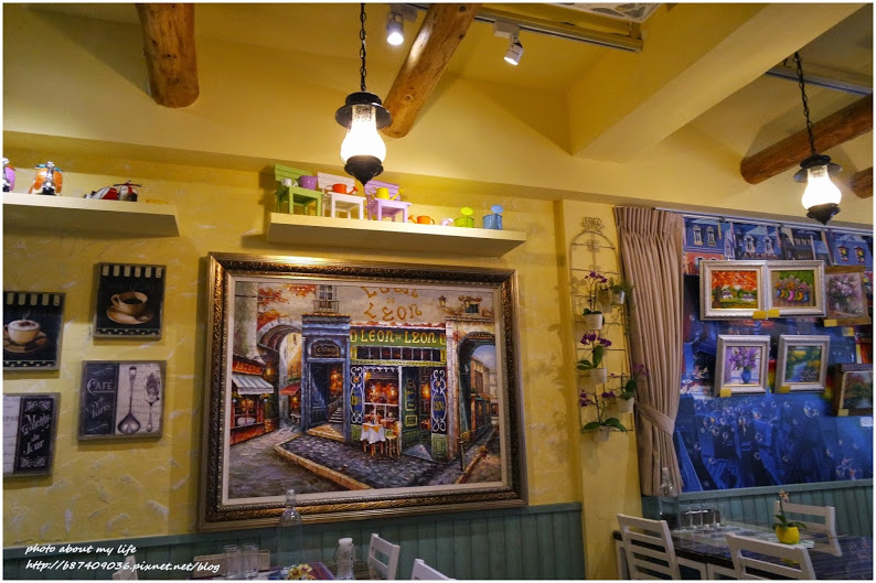 店內牆上掛了不少畫作 搭上鄉村小物和迷你盆栽 看似雜亂卻很溫馨