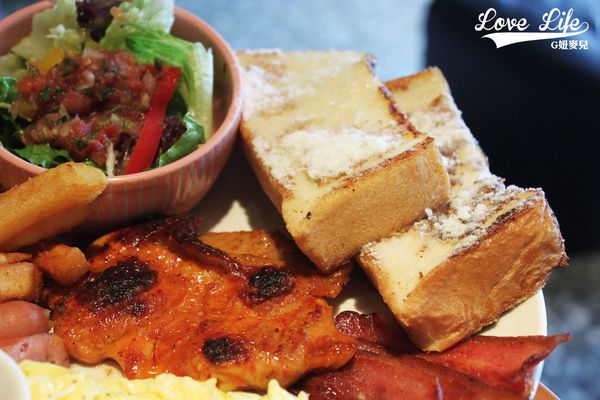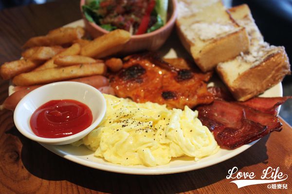 培根、辣味雞腿、德式香腸、脆薯、美式炒蛋、法式吐司、莎莎醬沙拉