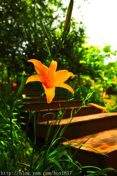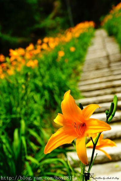 木造樓梯的二旁也盛開著金針花,漂亮極了,