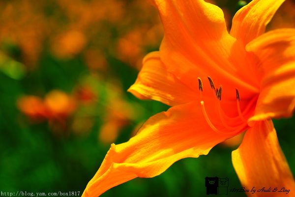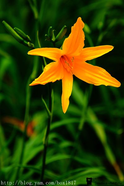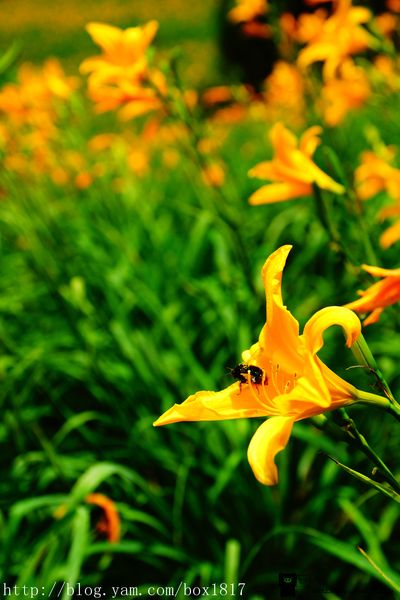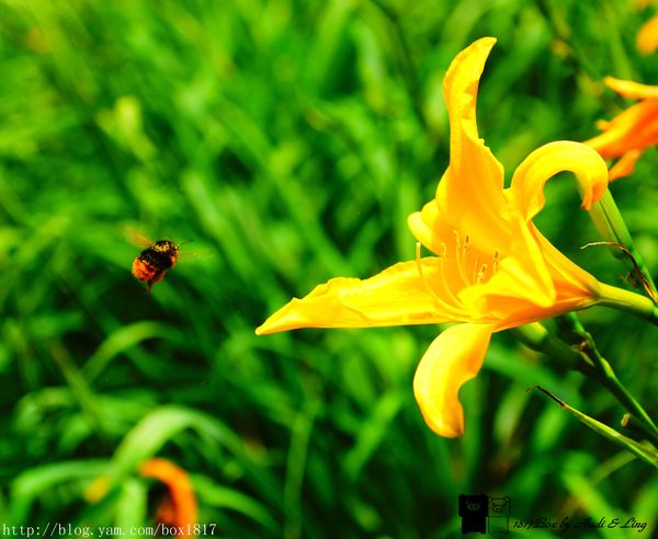 剛好補捉到一隻蜜蜂飛來金針花的畫面,