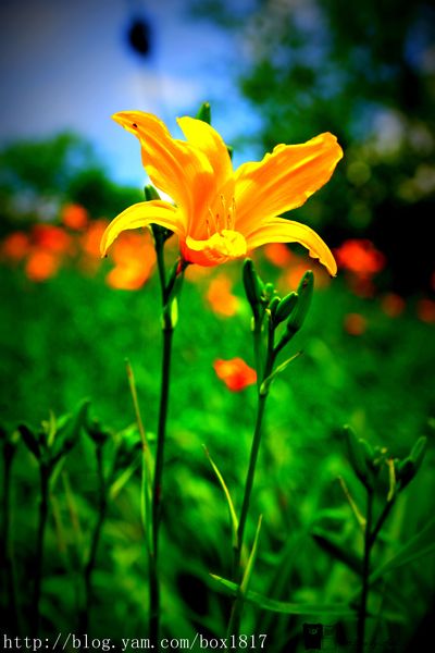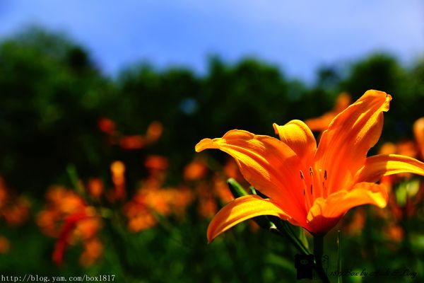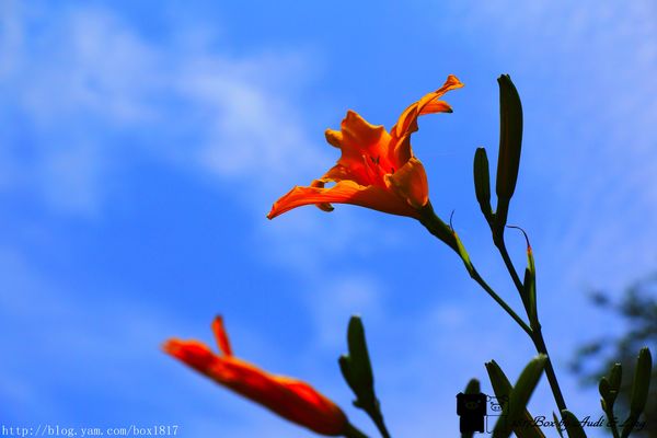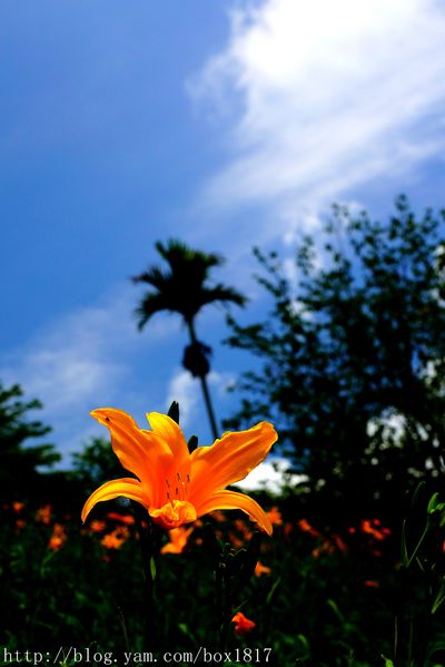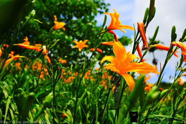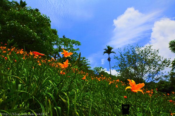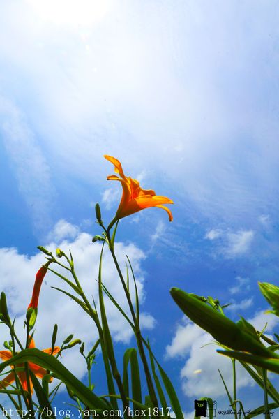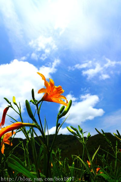 金針花在藍天白雲的陪伴下,