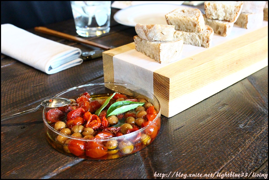 再來出現的是東西交融的一道菜:蕃茄破布子醬綴九層塔搭農夫麵包,