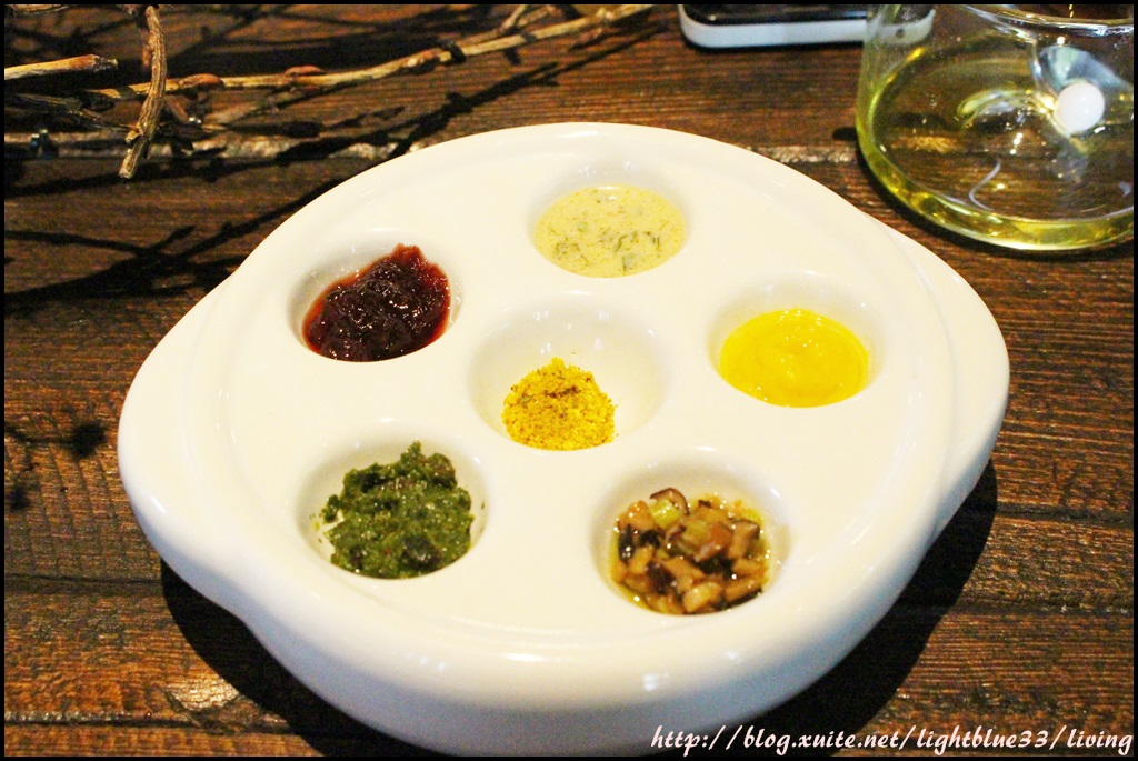 再來是以烤田螺盅擺放的六色沾醬,分別有:
