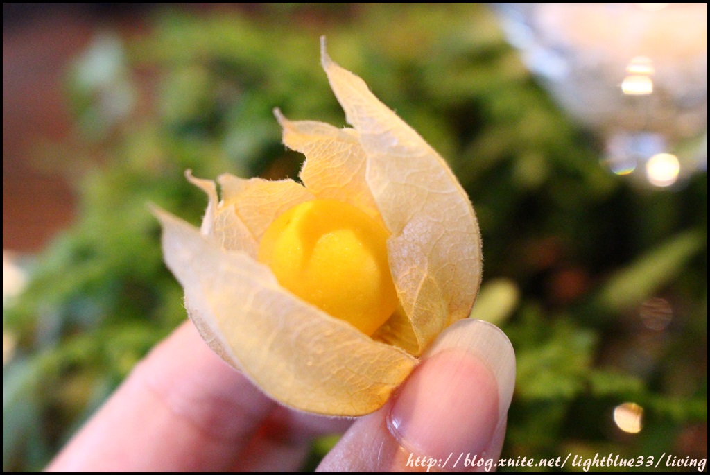 等待時,主廚告訴我們原來草圈圈上是有玄機的,這是酸漿果,