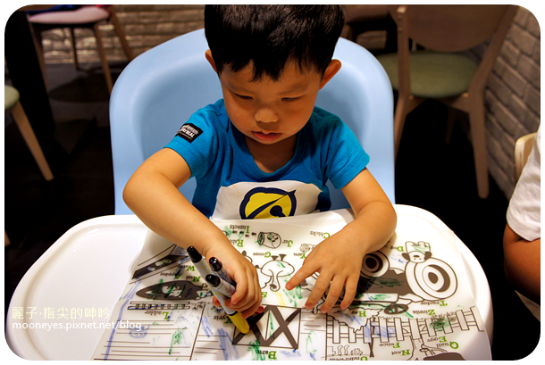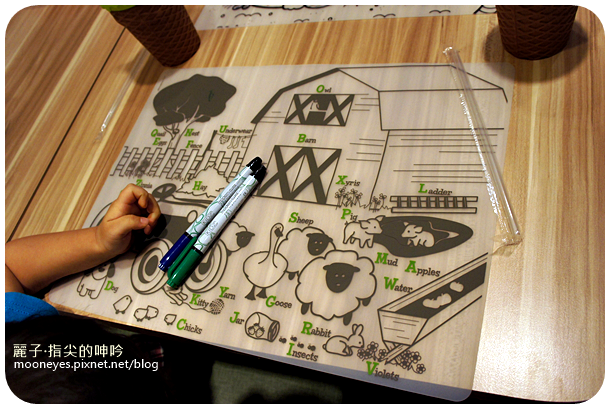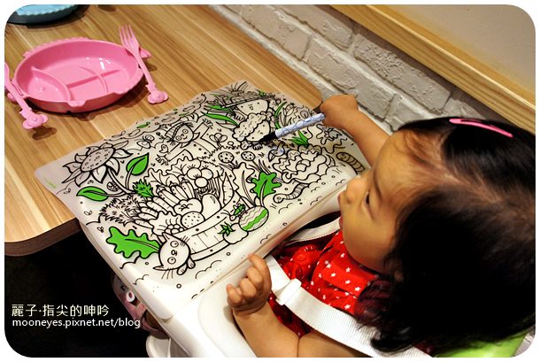 店家考量到此,提供了無毒的可洗顏料畫筆之外,還有可塗鴉的畫墊!