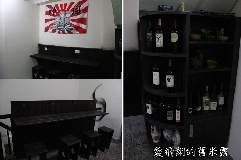 上二樓後,和樓下風格迥異,白色基底日式風格,較為明亮的感覺,此區是單人用餐區,還提供電源充電,和Wify服務,旁放置一酒櫃,上面放酒和一些陶瓷藝術,