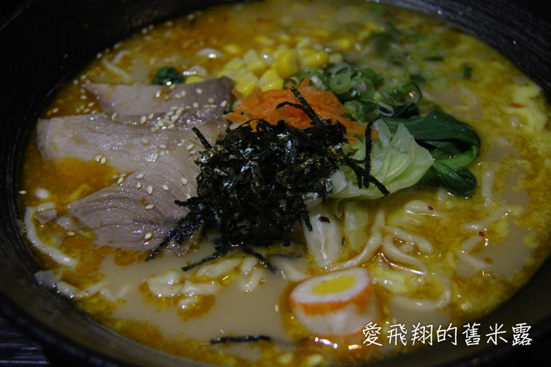 麵是粗麵,咬起來口感Q彈帶勁,感覺想烏龍麵的咬勁,一邊吃麵喝湯,加上三片燒肉、青菜、海苔絲、玉米配菜,口味辣而清爽美味。